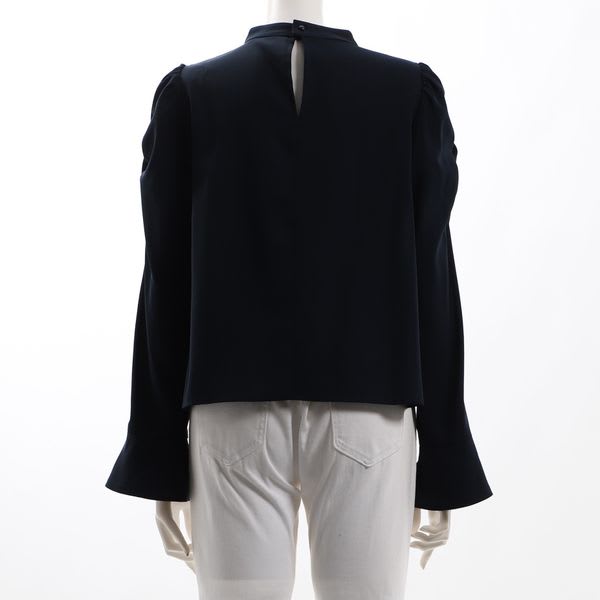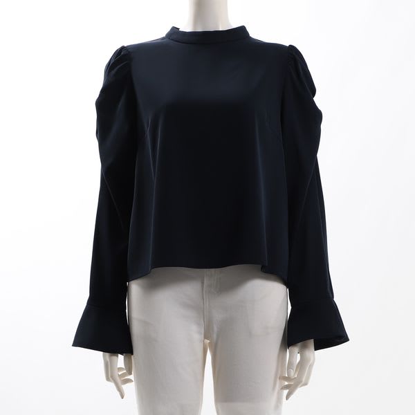 パワーショルダーと袖口のフリルがアクセントになったスタンドカラーブラウスです。Aラインスカートとラウンドトゥパンプスを合わせて、フェミニンな着こなしに。ワイドパンツとスニーカーを合わせて、程よくラフ感のある着こなしにしても◎