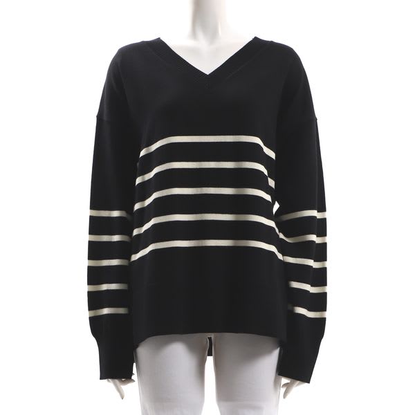 ボーダー柄のVネックニット。カーゴパンツを合わせてマニッシュな着こなしに、ティアードスカートを合わせて女性らしい着こなしも素敵ですよ。
