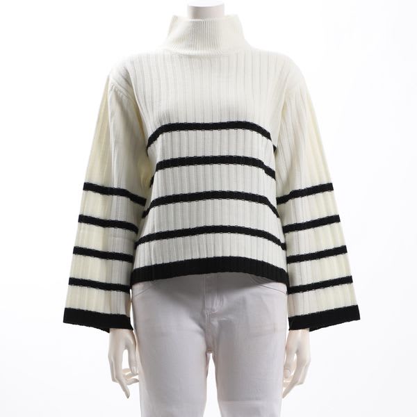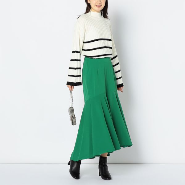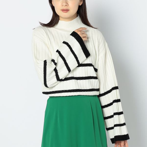 ボーダー柄のボトルネックニットです。デニムパンツとスニーカーを合わせてカジュアルに、タイトスカートとポインテッドトゥパンプスでクールな着こなしもいいですね。