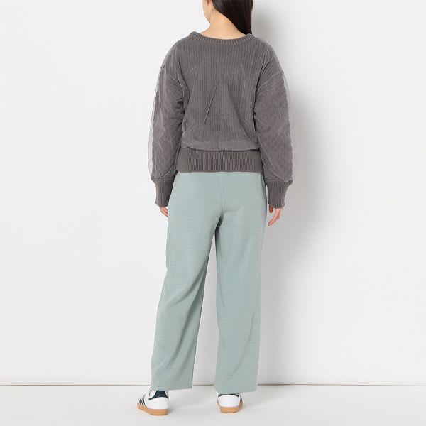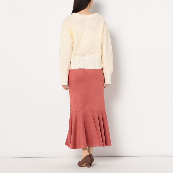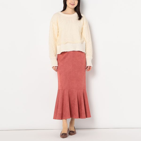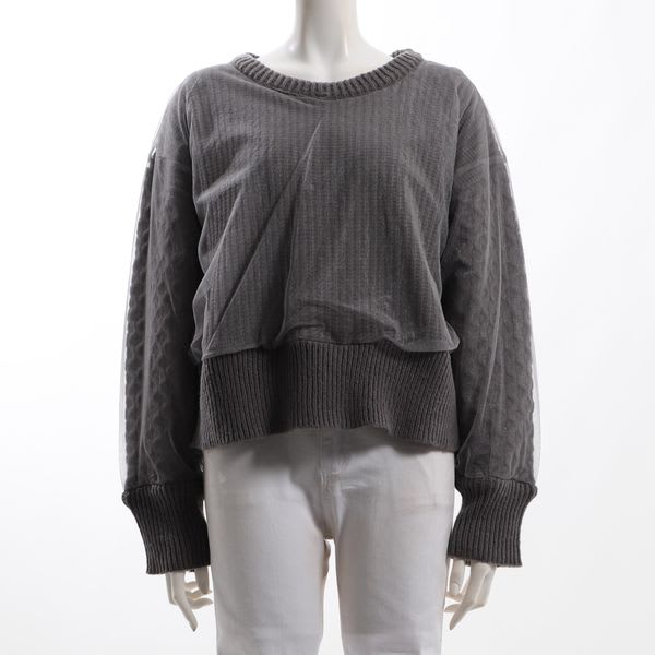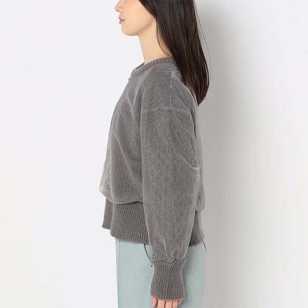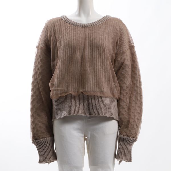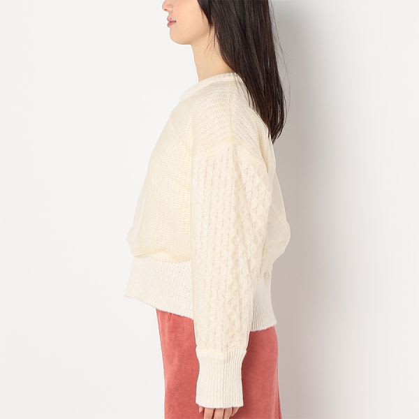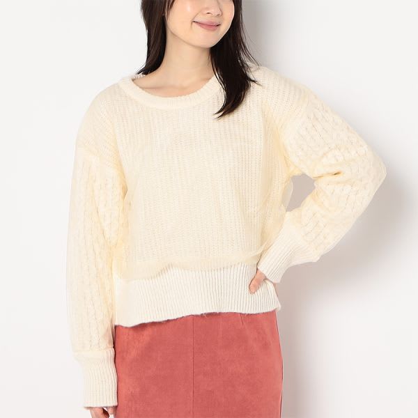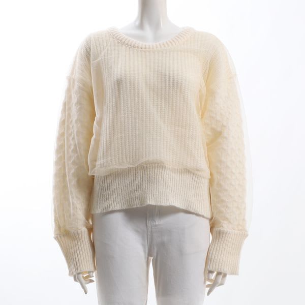 チュールを重ねたデザインの袖ケーブルニットです。ボトムスにはタイトスカートを合わせて女性らしい雰囲気に、デニムパンツでカジュアルに仕上げても素敵です。