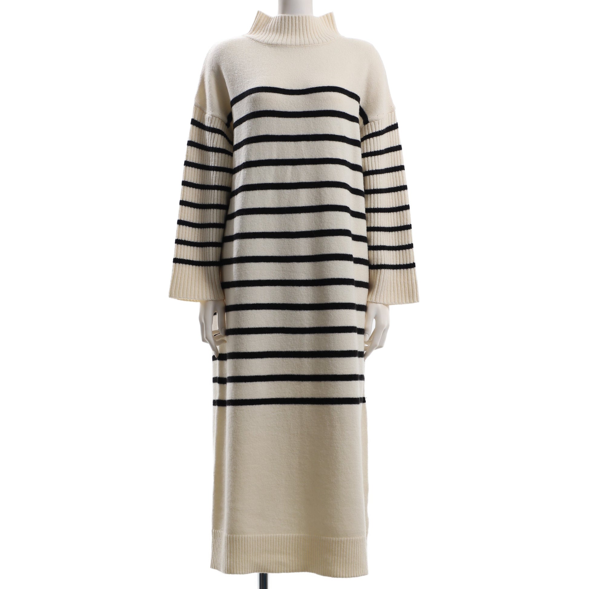 ボーダー柄のハイネックニットワンピースです。スニーカーを合わせてアクティブに、ヒール付きのショートブーツを合わせてすらっときれいめに仕上げても良いですね。