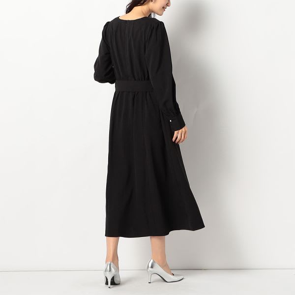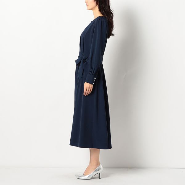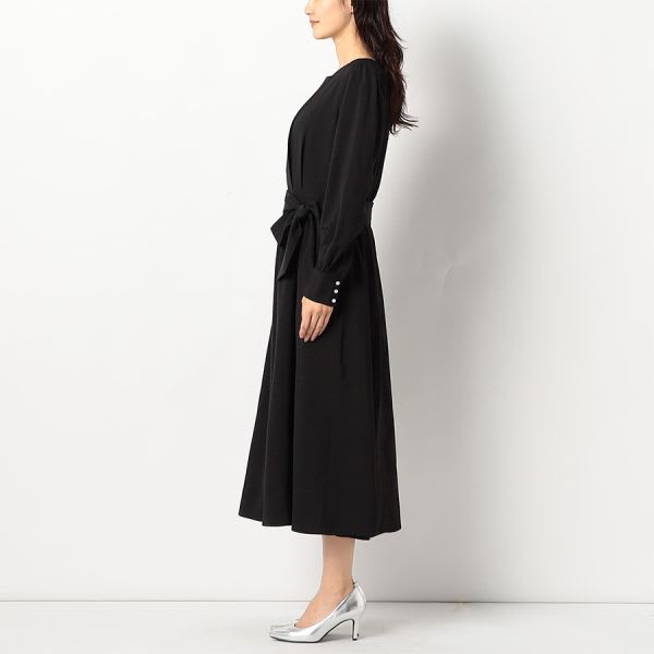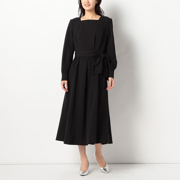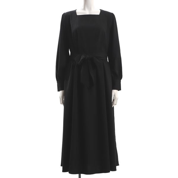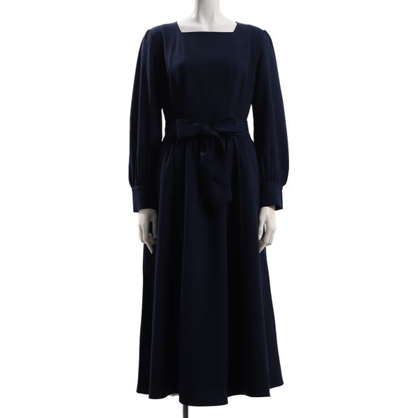 ウエストリボンパールデザインスクエアネック長袖ワンピース