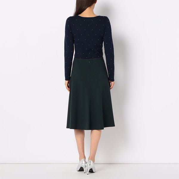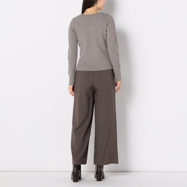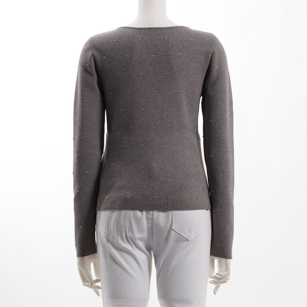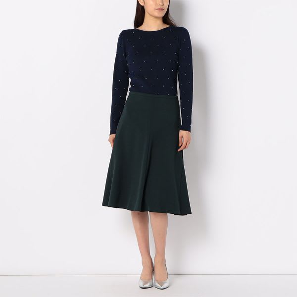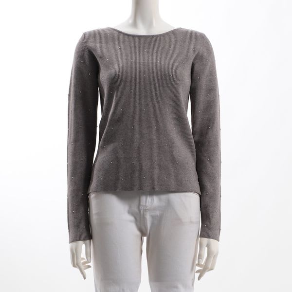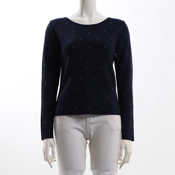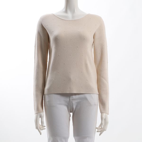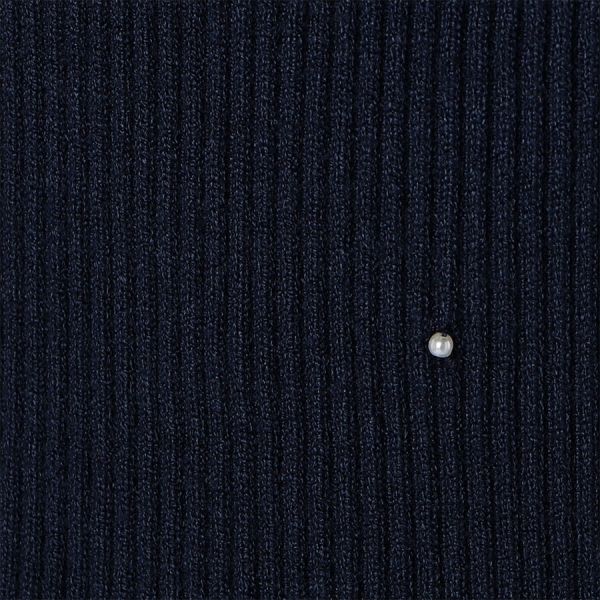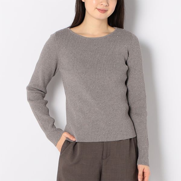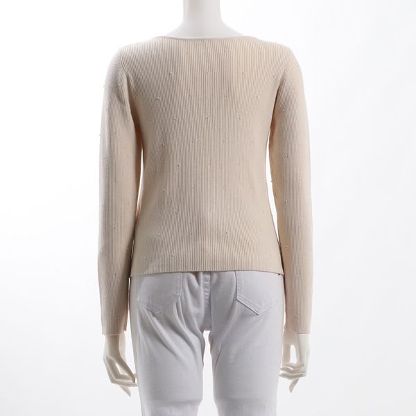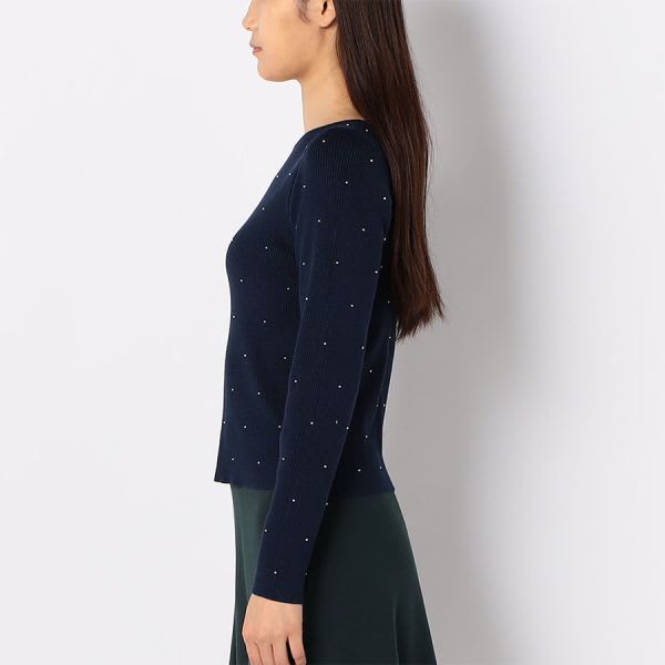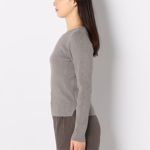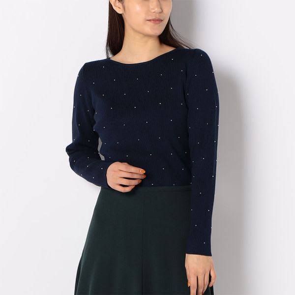 パールデザインで華やか見えするリブニットです。マーメイドスカートにバレエシューズを合わせて、大人可愛く。デニムパンツにスニーカーを合わせて、カジュアルに着こなしてもステキですよ。