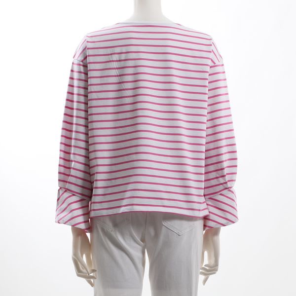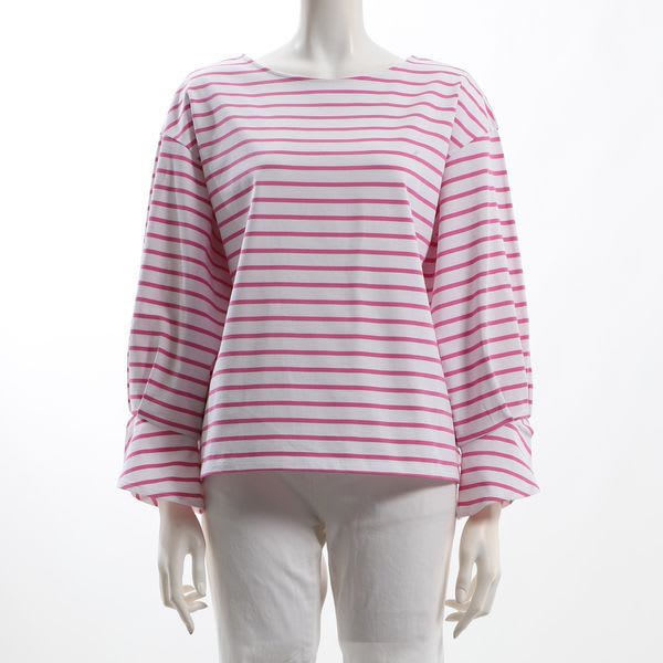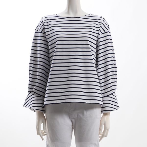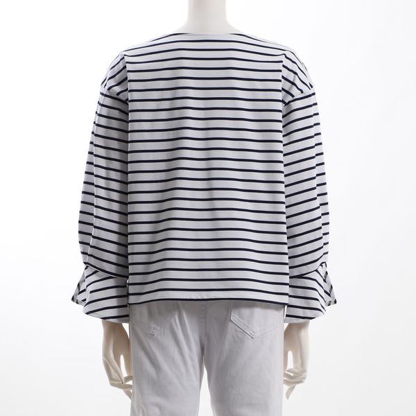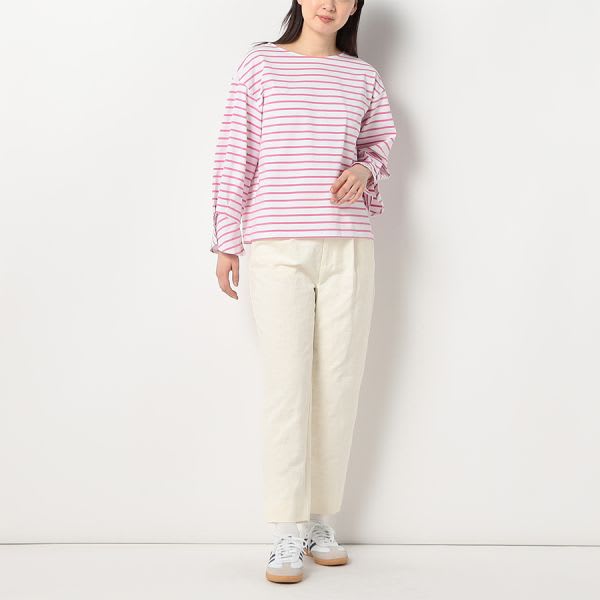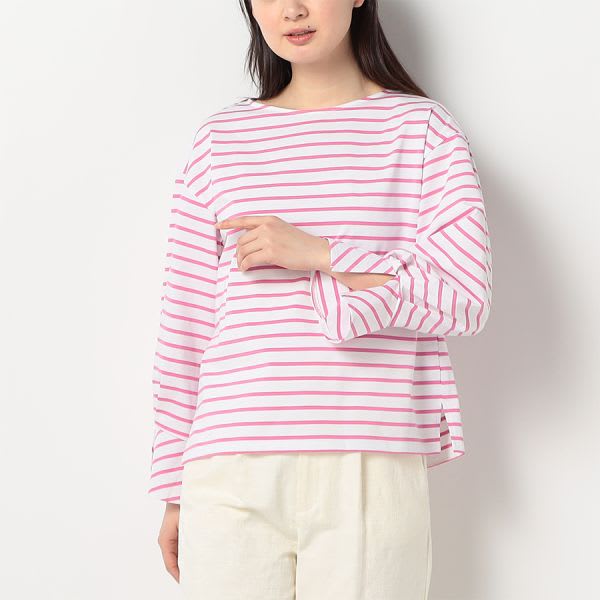 ボートネックのボーダー柄のプルオーバーです。ワイドパンツとローファーを合わせてマニッシュなスタイルに、デニムパンツとスニーカーを合わせたカジュアルなスタイルに仕上げていただくのも素敵ですよ。