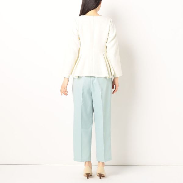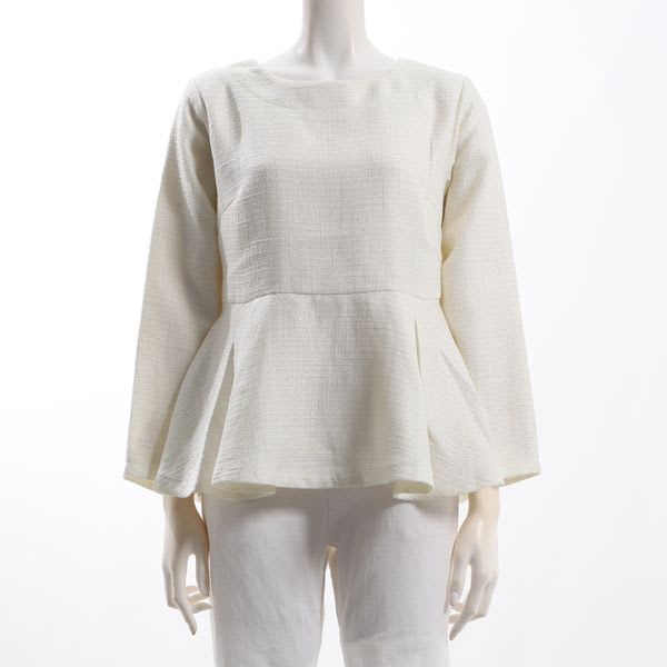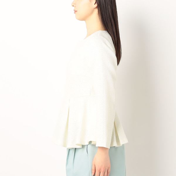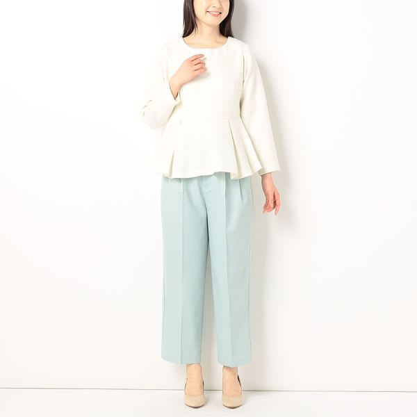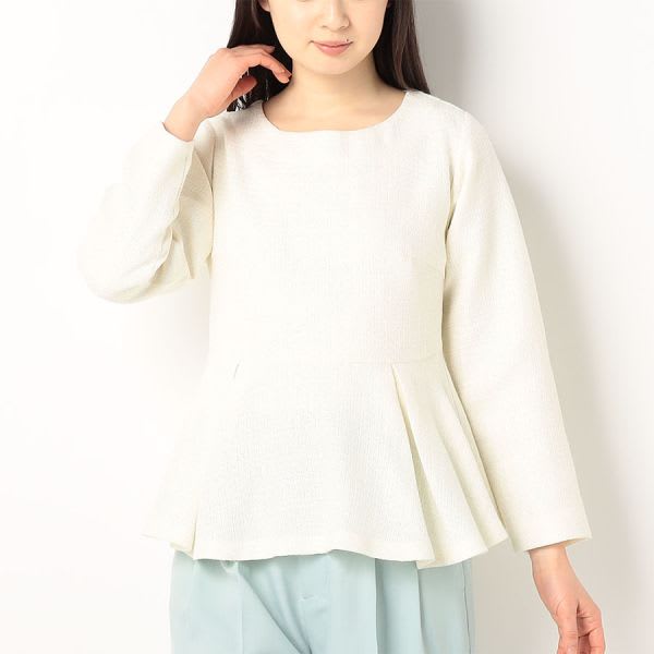 ペプラムブラウスです。テーパードパンツにビットローファーを合わせて、トラッドに。タイトスカートにラウンドトゥパンプスを合わせて、女性らしく着こなしてもステキです。