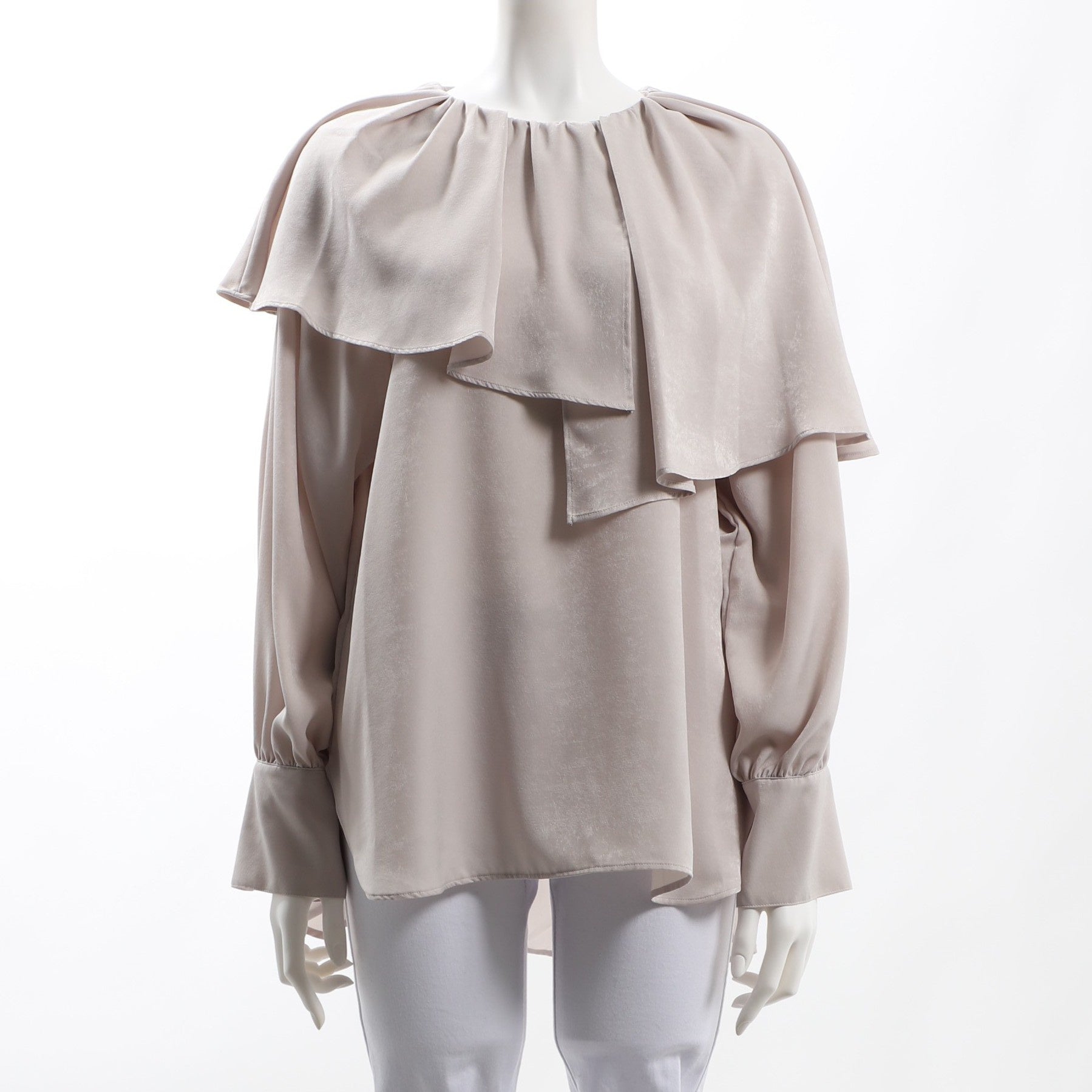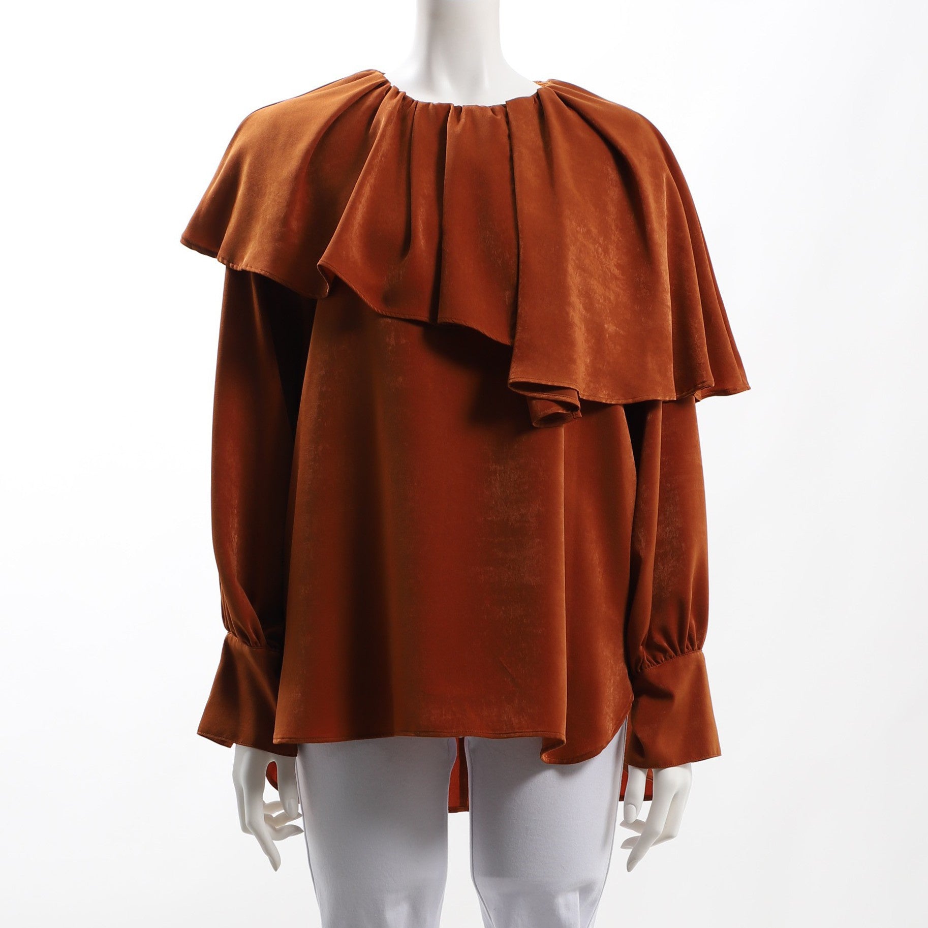 首元から広がった大胆なフリルが華やかなブラウスです。