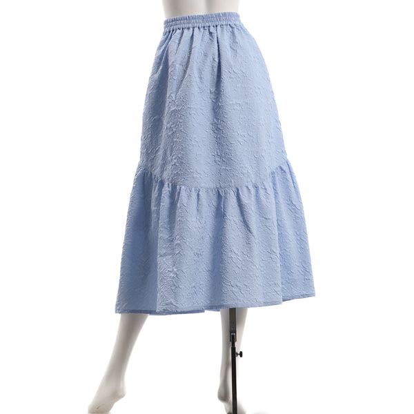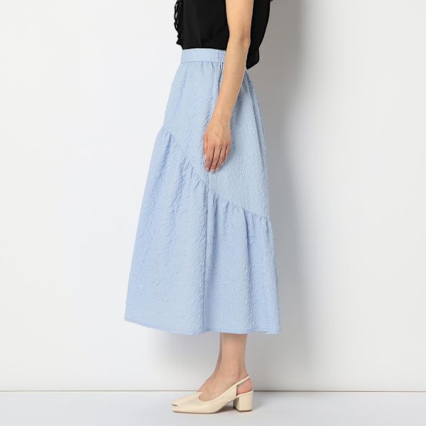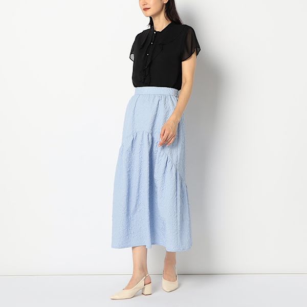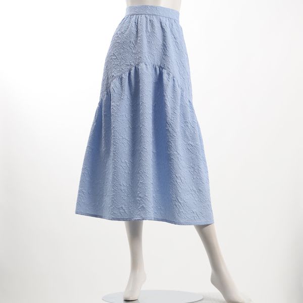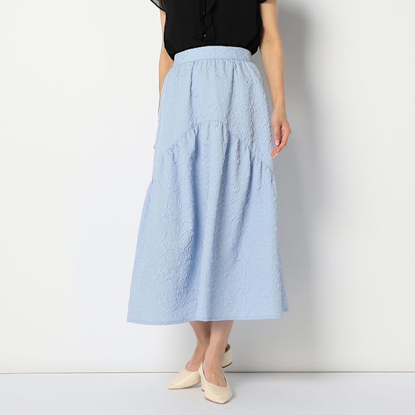 切り替えラインがポイントのジャガードフレアスカートです。とろみブラウスとパンプスを合わせてキレイめスタイルに、カットソーとサンダルを合わせてカジュアルなスタイルに仕上げていただくのも素敵ですよ。