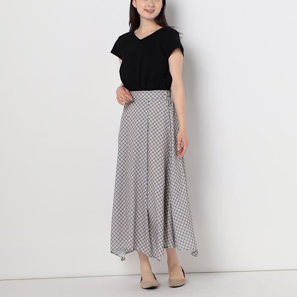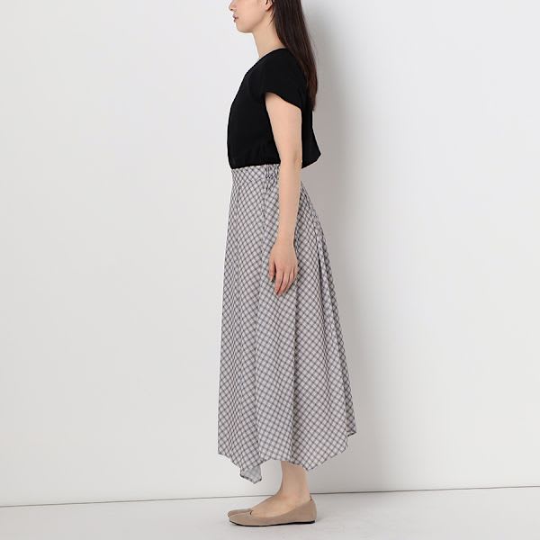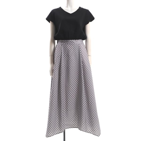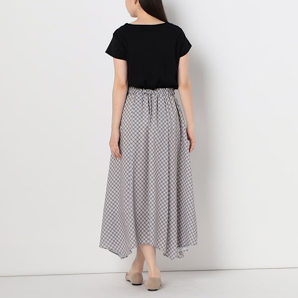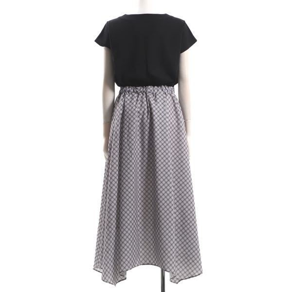 チェック柄のスカートがドッキングされたワンピースです。パールモチーフのイヤリングとパンプスを合わせてキレイめスタイルに、トートバックとスニーカーでカジュアルなスタイルにもオススメですよ。