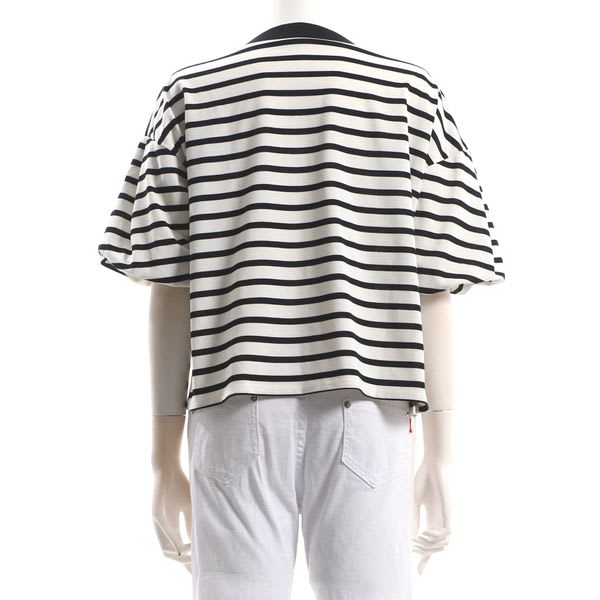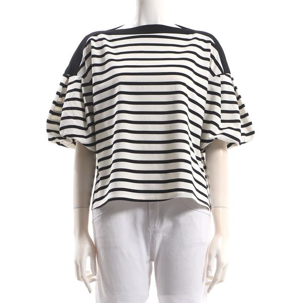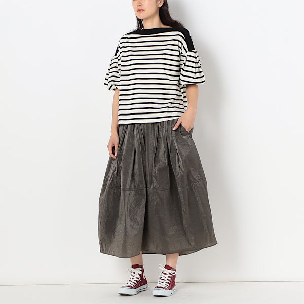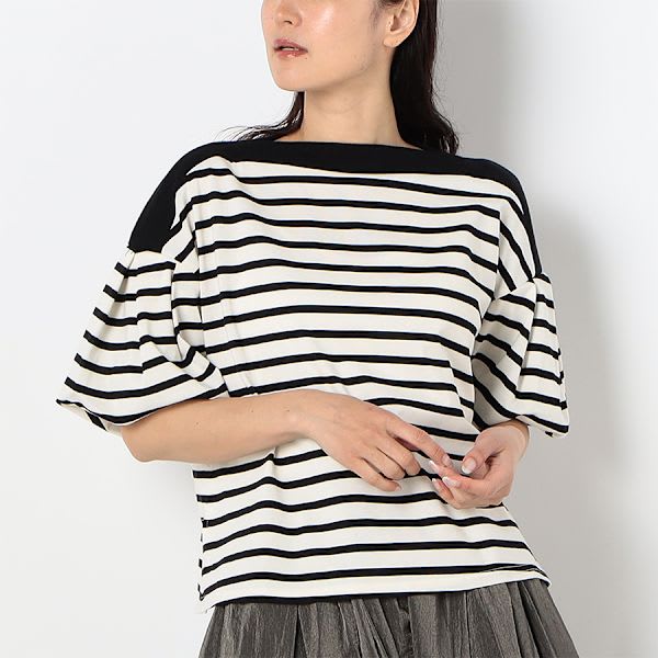 お袖のボリューム感がポイントのボーダー柄カットソーです。デニムパンツにスニーカーを合わせて、カジュアルに。ギャザースカートにバレエシューズを合わせて、大人可愛く着こなしてもステキですよ。