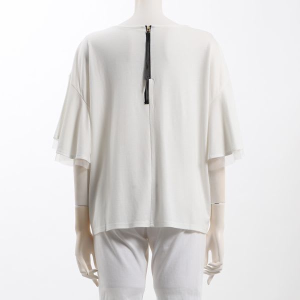 バックのファスナーデザインやお袖のチュールがポイントのカットソーです。デニムパンツとスニーカーを合わせてカジュアルに、フレアスカートとパンプスでレディライクにまとめてもいいですね。