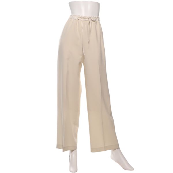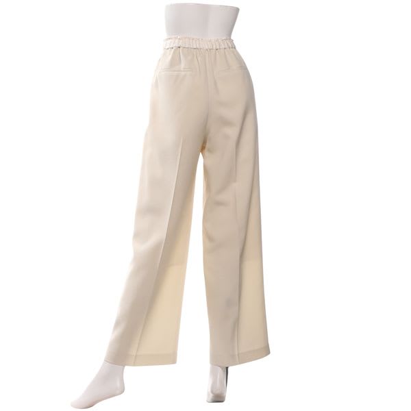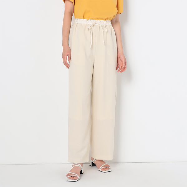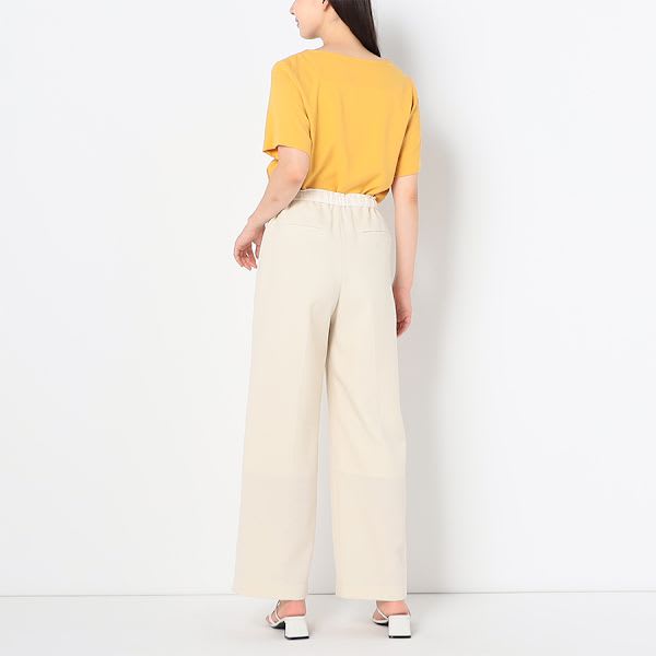 異素材切り替えのドロストワイドパンツ。フーディパーカーを合わせてマニッシュな着こなしに、ペプラムブラウスを合わせて女性らしい着こなしもいいですね。