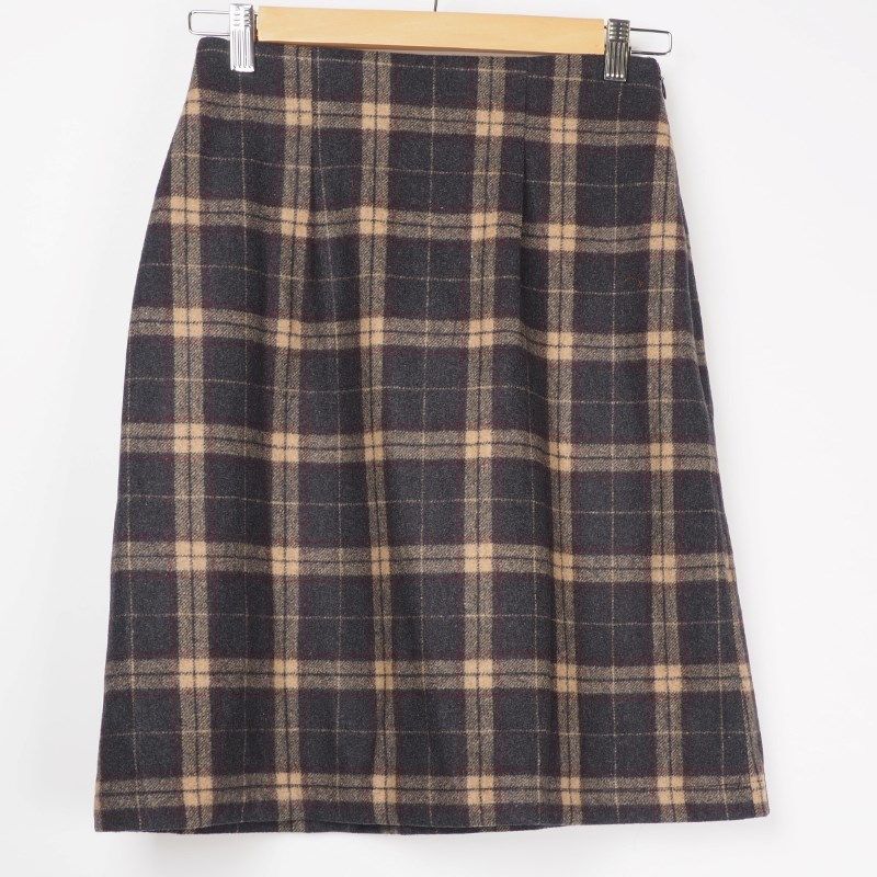 大柄のチェックなので、トップスはブラウスやカーディガンを合わせて女性らしく。