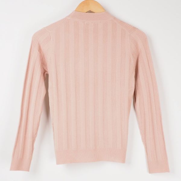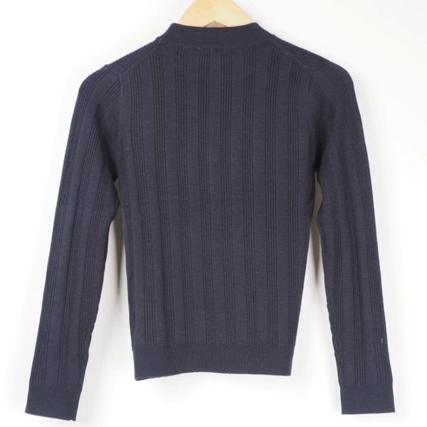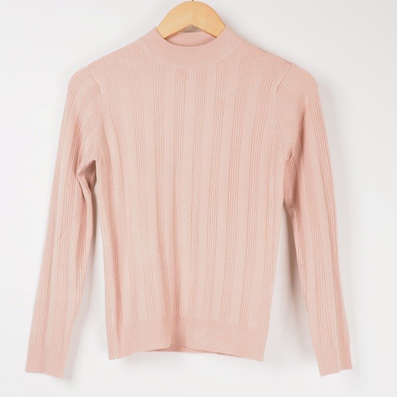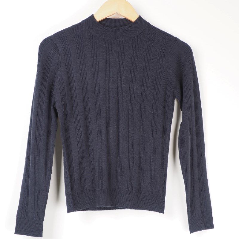 クルーネックの細リブニットはスタイルを綺麗に見せてくれる1枚。厚手すぎないため、季節は長く着用できますね♪