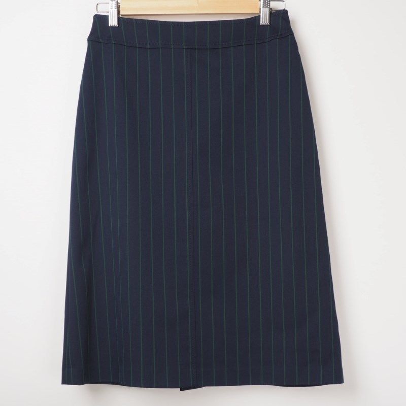 ストライプの柄が縦のラインを強調し、スタイルアップに見せてくれる台形スカート。オンオフ幅広く着用できそう♪