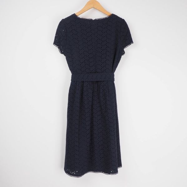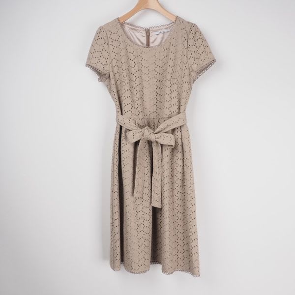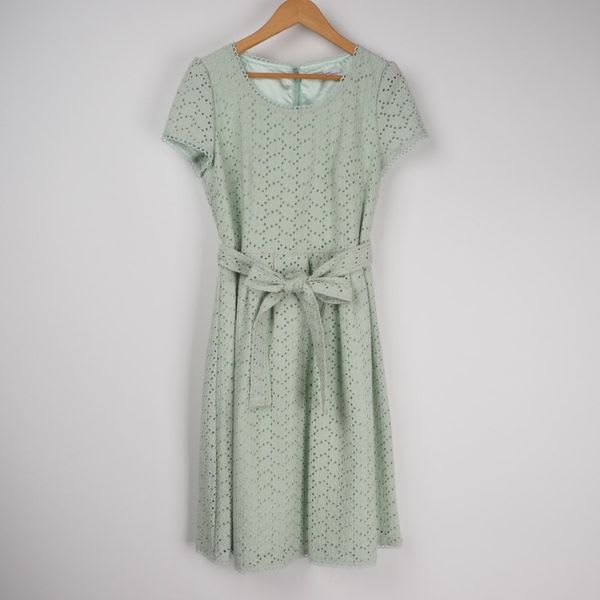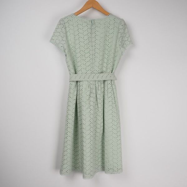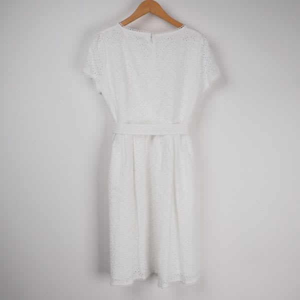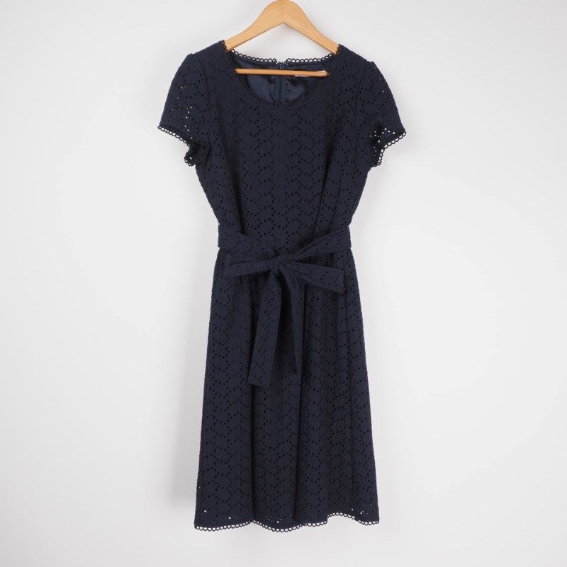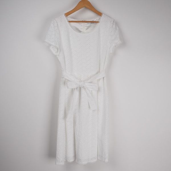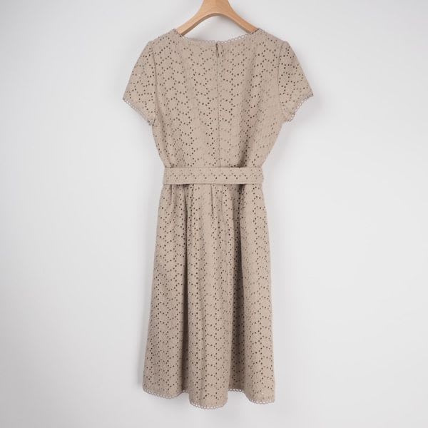 コットンレースのワンピース。ウエストリボンが女性らしい印象にしてくれますね。足元はヒールパンプスでエレガントに、フラットシューズで大人可愛くしても相性◎です。アクセントに鮮やかな色のカーディガンを肩がけしてポイントを入れるのもおすすめですよ。