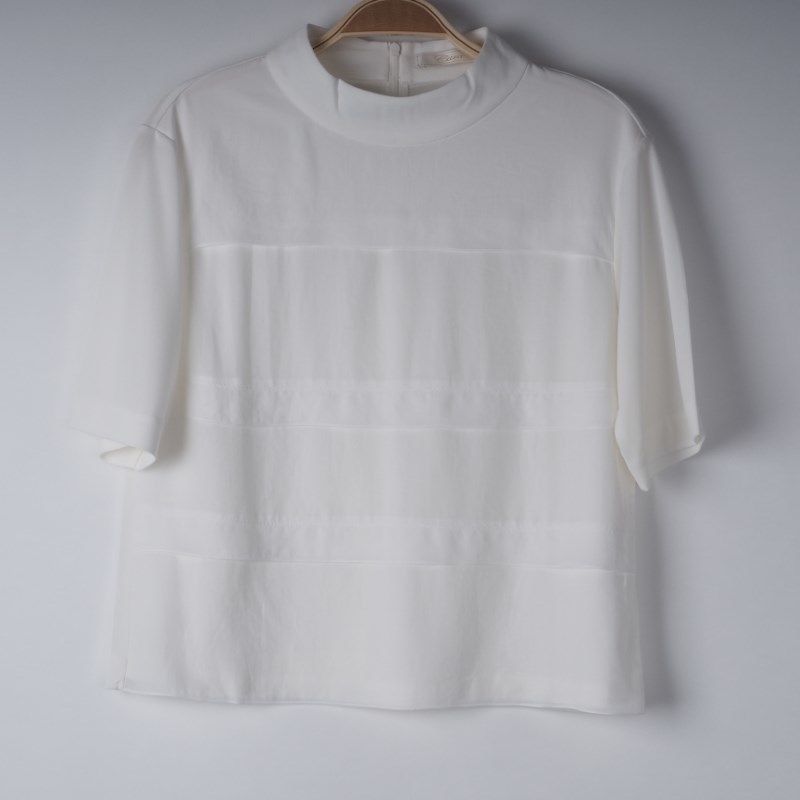 「シンプルで、スカートやパンツ、どちらにも合わせられました。シンプルなものと柄物が入っているとバリエーションがあってコーディネートが楽しくなります。」 「ハイネックは大好きなデザインです。ティアードが胸元をふわっと見せてくれるので、気に入りました。真っ白過ぎない色合いが、くすみ気味な顔色にちょうど良かったです。袖丈も二の腕が出過ぎない、ちょうど良い丈だと思います。」 「ハイネックブラウス、すごく好きです。ティアードデザインもステキです。手持ちのネイビーのスカートに合わせて職場に着ていきました。ありがとうございます!」 「何よりボーイッシュな髪型にあうのが嬉しいです。着心地がいい。素材もオシャレで手触りもとても気に入りました。ネックの形も好きでした。二の腕も隠れるのでホッとします。一緒に来たパンツと合わせたら少しおばさんぽいので違うのと合わせた方がいいかもですね。スカートも合わせられそうですね。」 「首の詰まっている物も好きなのですが、夏はVネックだ首元が開いている物も着てみたいと思います。」