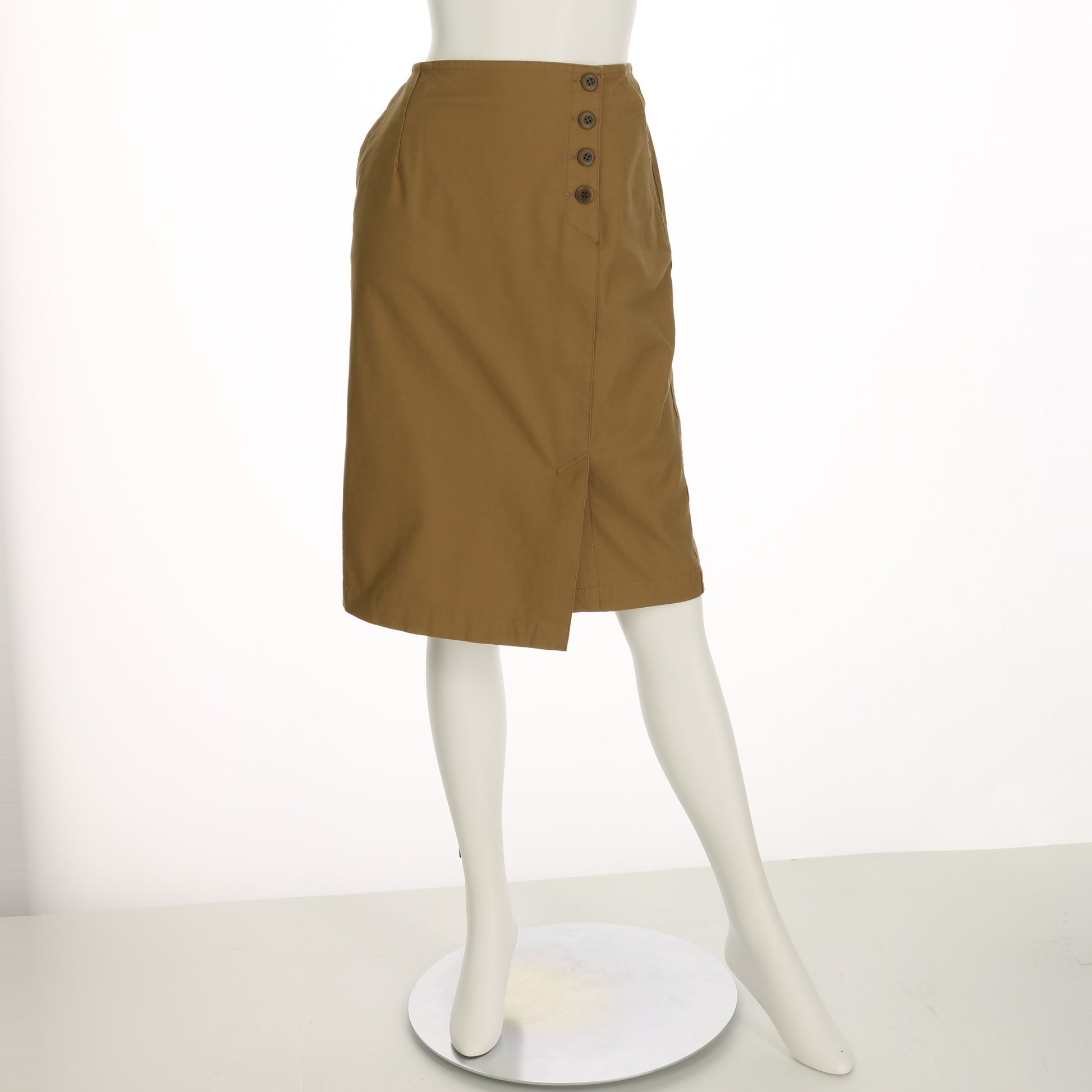 ボタンデザインがポイントのラップ風スカート。シャツを合わせてきれいめに、カットソーを合わせてカジュアルな着こなしも◎ですよ。
