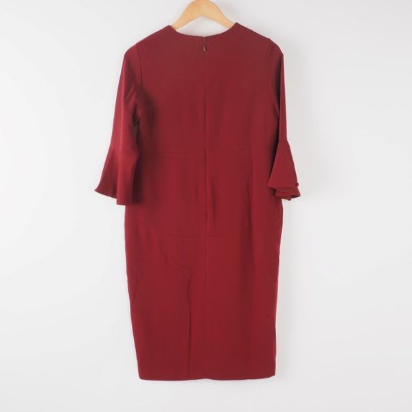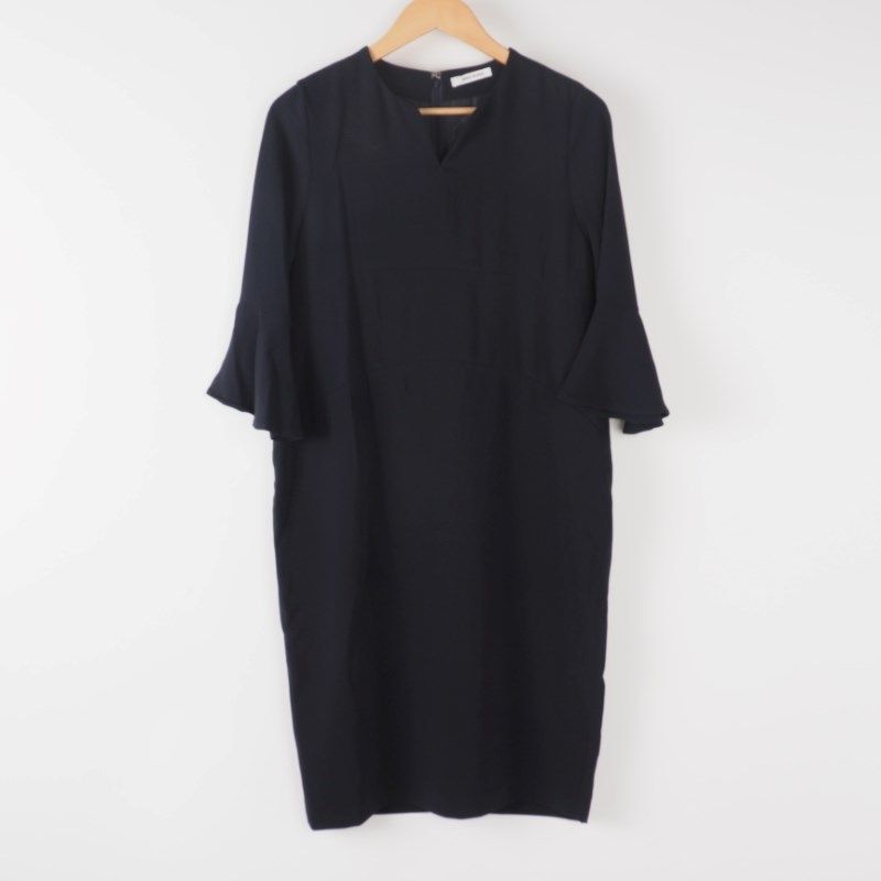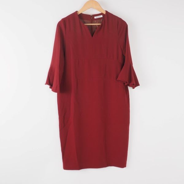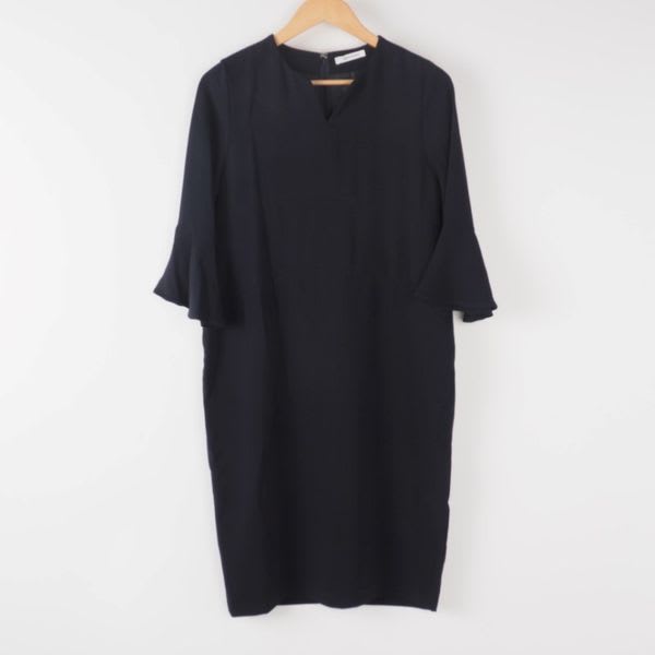 ベルスリーブが上品なスリットネックのワンピース。シンプルなショートネックレスとエナメルパンプスでラグジュアリーなスタイルに。大ぶりのアクセサリーとワンストラップシューズを合わせてクラシカルな印象に、細めのベルトでウエストマークしてブラウジングするもの良いですね。