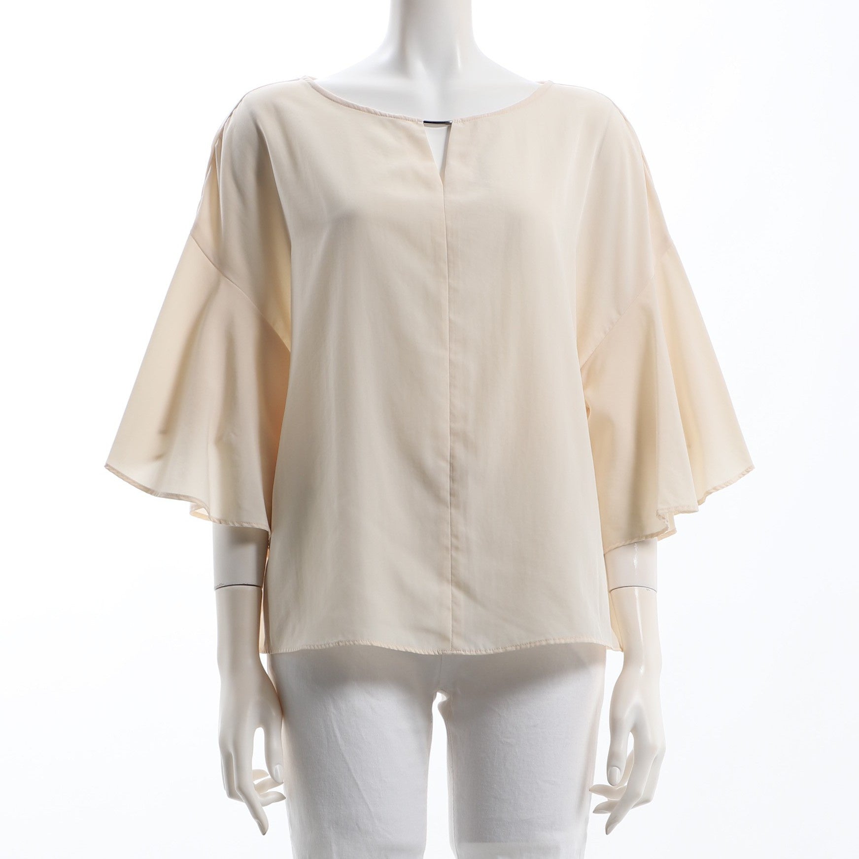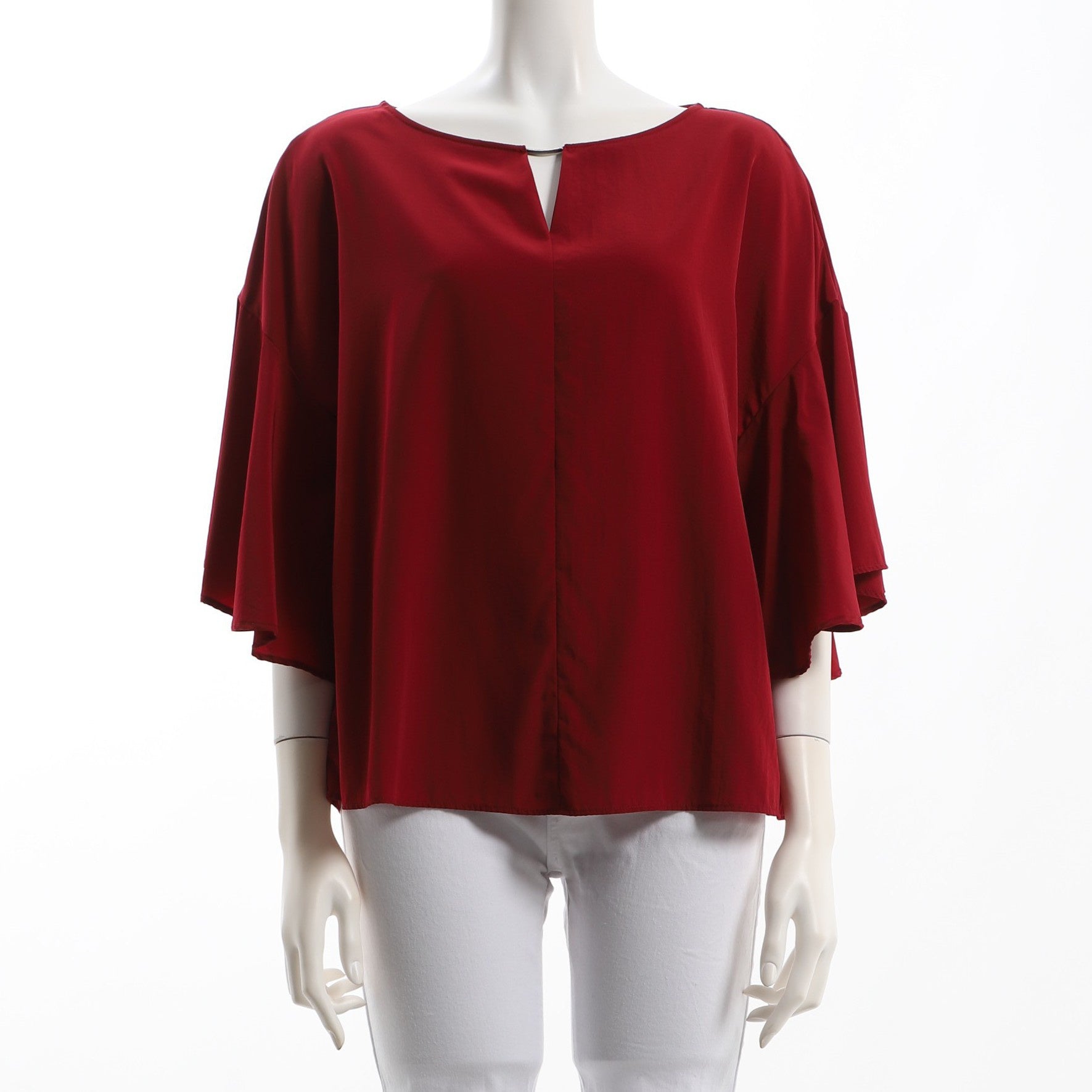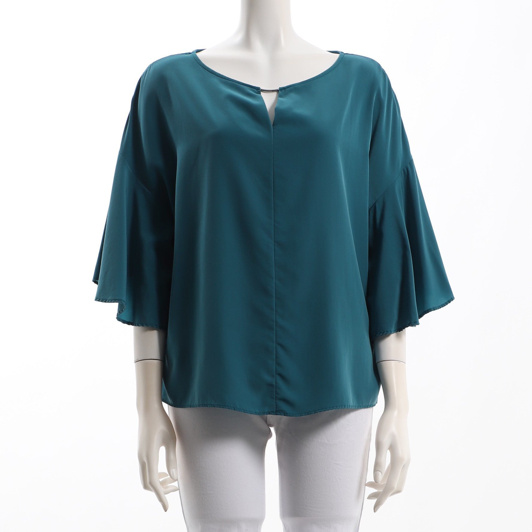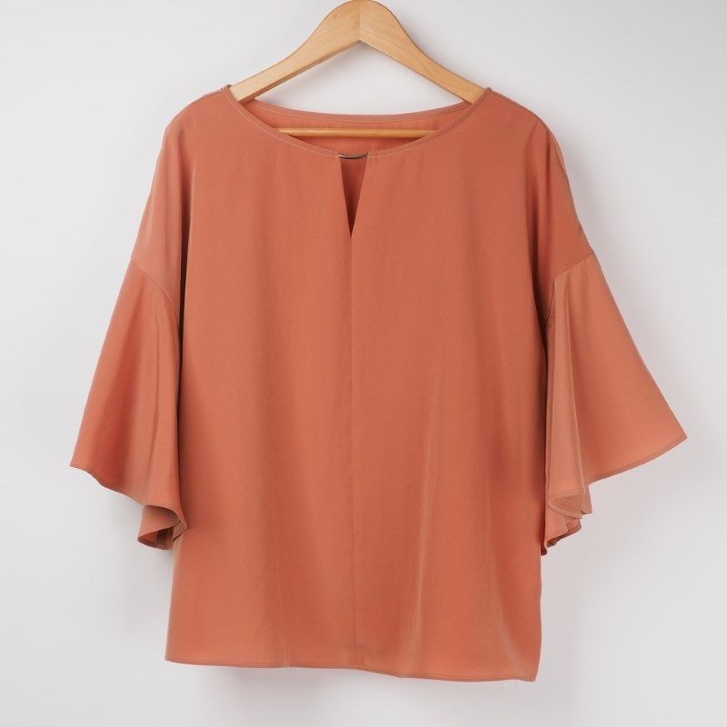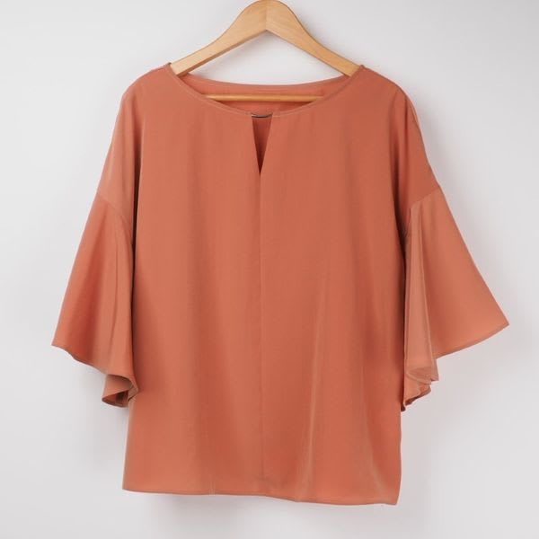 オープンフロントネックのブラウスは、フレア袖で腕をスラッと見せてくれるのが嬉しいアイテムです。センタープレスパンツを合わせてキレイめオフィスカジュアルスタイルに仕上げたり、ロングプリーツスカートを合わせてエレガントなスタイルに仕上げたりと、色々な着こなしが完成しますね!