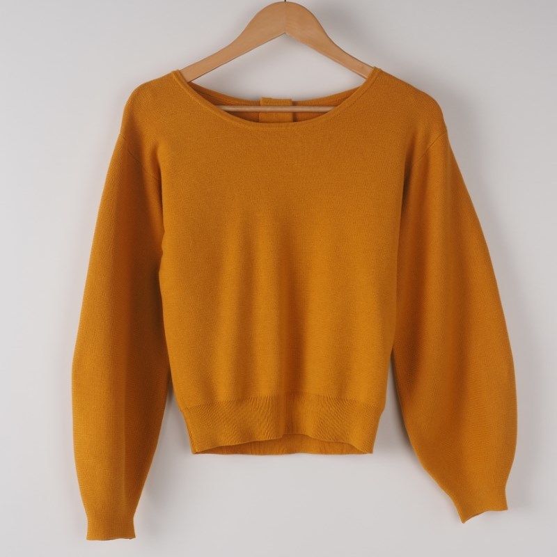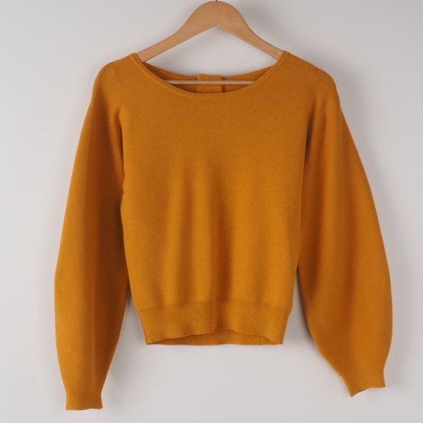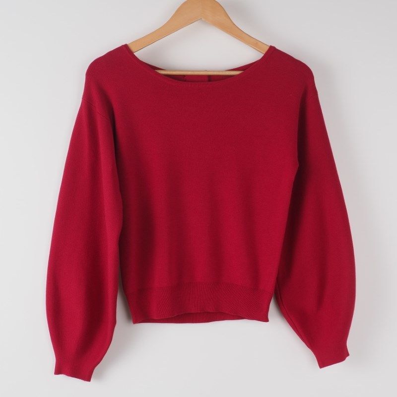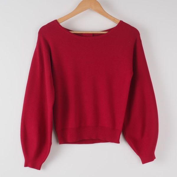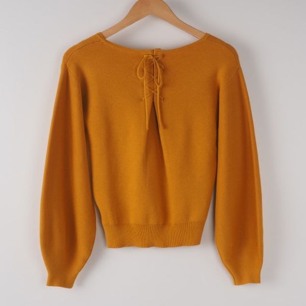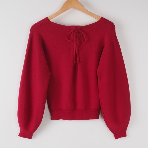 バルーンスリーブが可愛らしいボートネックニット。バックのレースアップデザインもオシャレ。プリーツスカートを合わせてレディライクなスタイルに、ワイドパンツに合わせて甘辛ミックスコーデも楽しめますね!