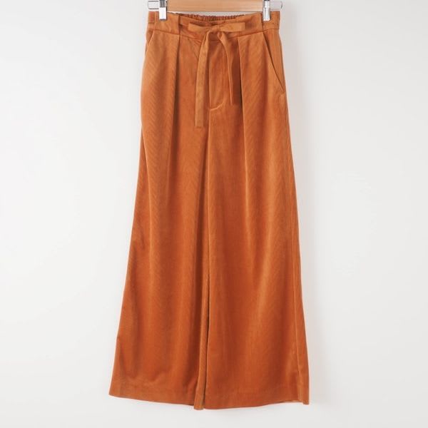 コーデュロイ素材のワイドパンツは、ウエストのリボンベルトデザインがポイントの1枚です。トップスはウエストインするとスッキリ着られますね。ブラウスを合わせてキレイめスタイルに、ニットを合わせて大人カジュアルスタイルも◎