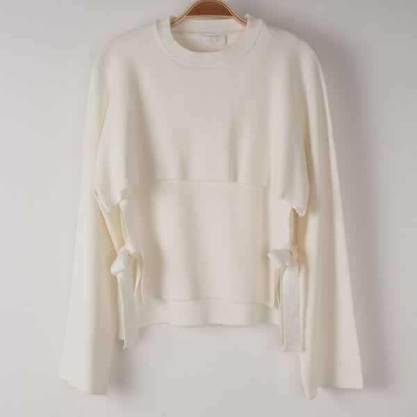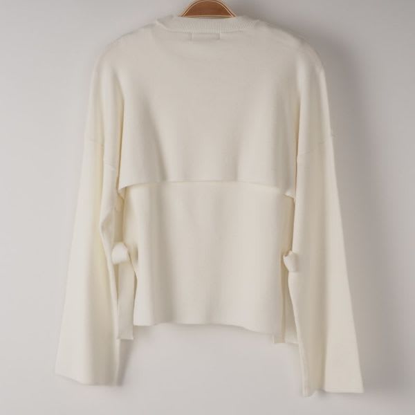 重ね着しているようなデザインのニット。サイドのリボンもポイントですね!ニットの下にカットソーを合わせていただくとサイドからちらっと覗く表情が素敵ですよ。