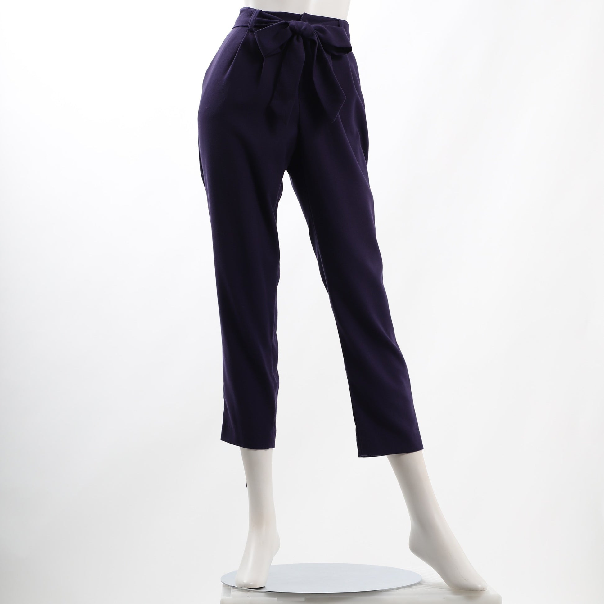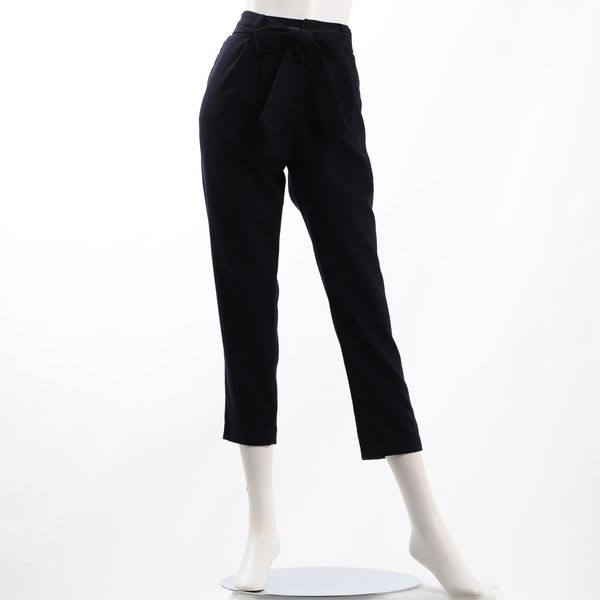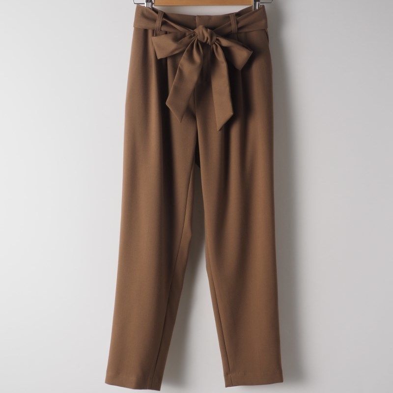 ウエストリボンがポイントのすっきりとしたパンツは、ウエストゴムで脱ぎ着しやすいのも嬉しいですね。とろみ感のあるブラウスとジャケットを合わせてオフィススタイルに、ラフなカットソーやニットを合わせて休日のリラックススタイルにと、オンオフ問わず着回せるアイテムです。