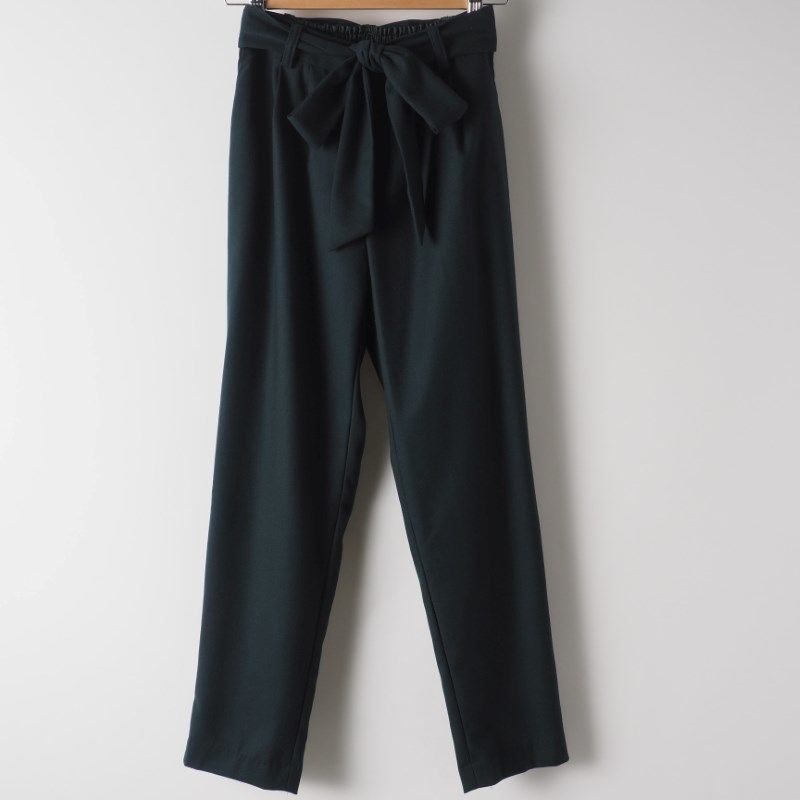 「パンツの素材が肌触りがよく着やすくて良かったです。色も良く、タックが入っているのでゆったりして着心地もとても良かったです。普段スキニーをよく履くのでもう少しフィット感があるといいなと思いました。ベルトの代わりのリボンが可愛くて素敵です。」