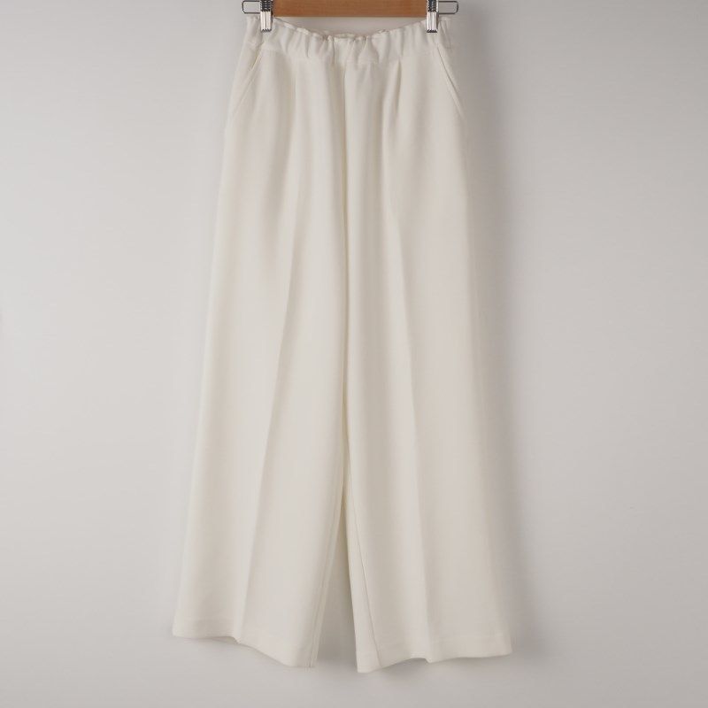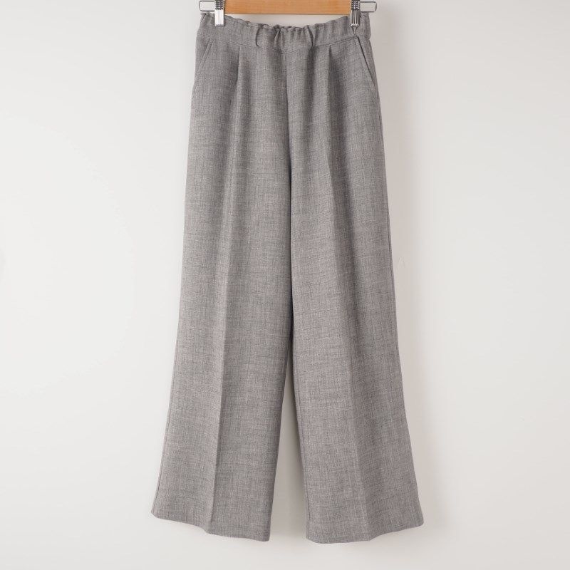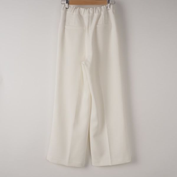 センタープレスが入ったワイドパンツは、ウエストゴムで楽に着られるアイテムですね。ブラウスでレディライクに合わせたり、シンプルなニットでマニッシュに合わせても素敵ですよ。