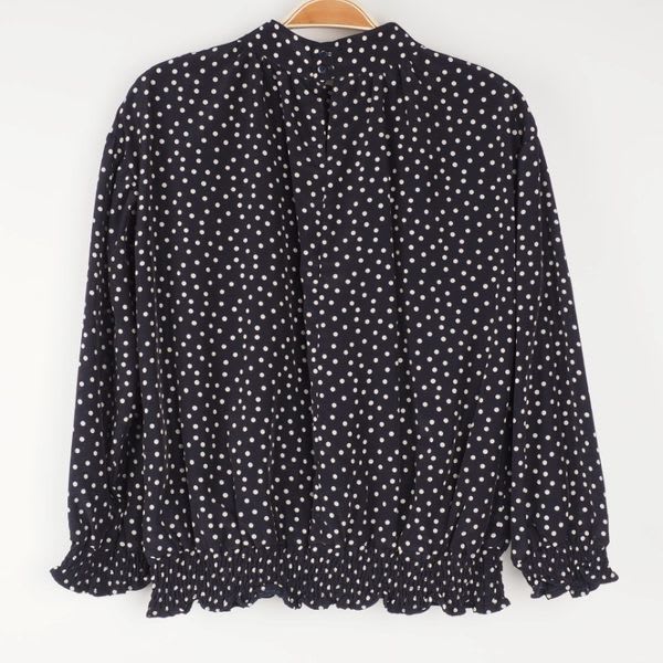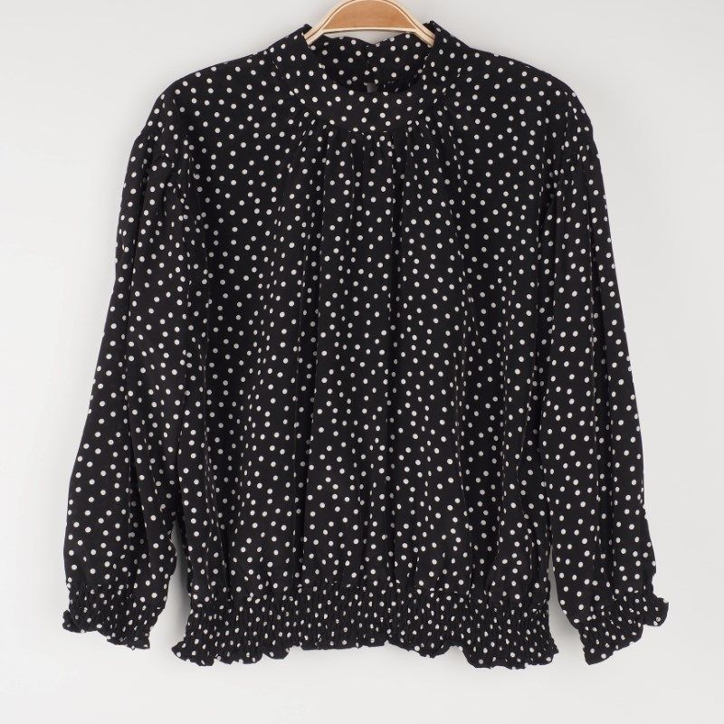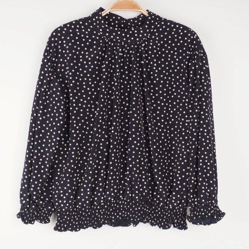 スタンドカラー風のドット柄ブラウスです。バックボタンや袖口のギャザーゴムが女性らしい雰囲気に。ボックスプリーツスカートに合わせてエレガントに、ワイドフレアパンツに合わせて優雅な感じも◎。デニムとの相性も良いですね!