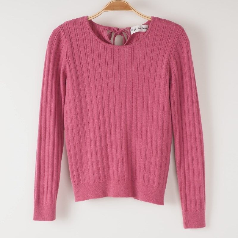 首元のバックデザインがポイントのリブニットは、フレアスカートと合わせてレディライクに、きれいめパンツでスマートな着こなしも素敵ですよ!バックデザインの部分は、一重に結んだり、リボン結びなどアレンジが楽しめますね。