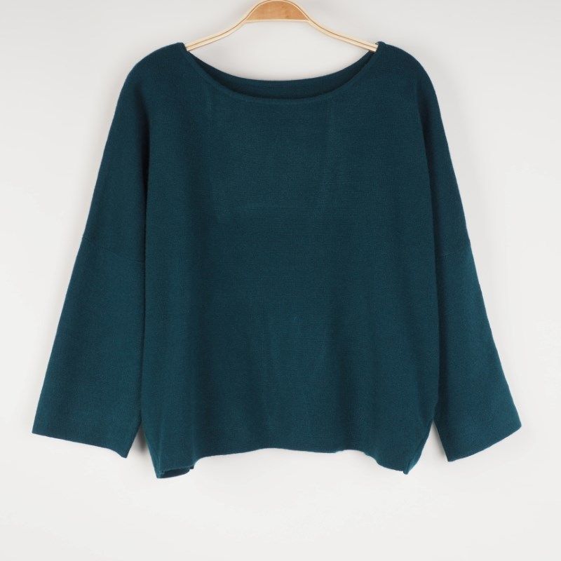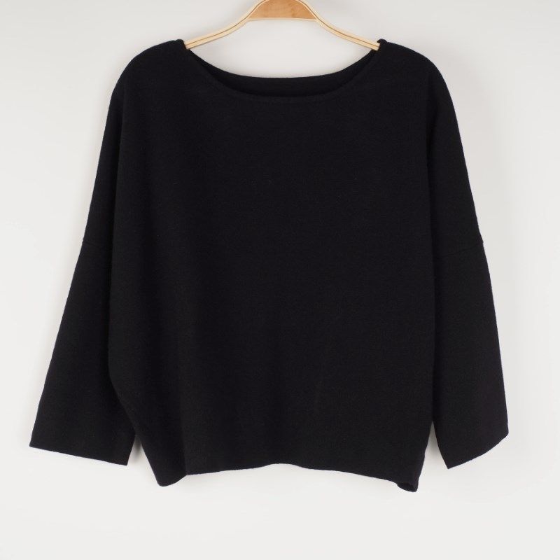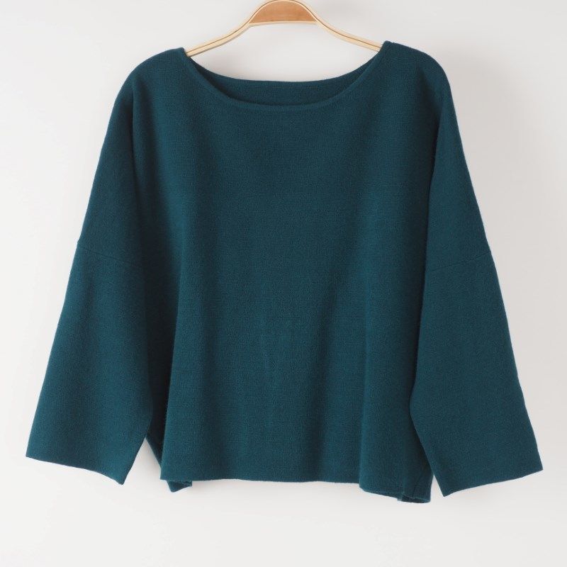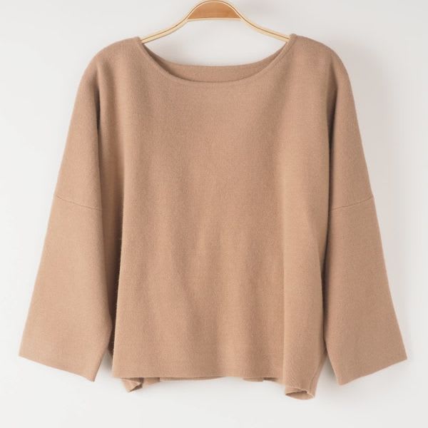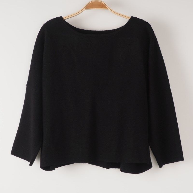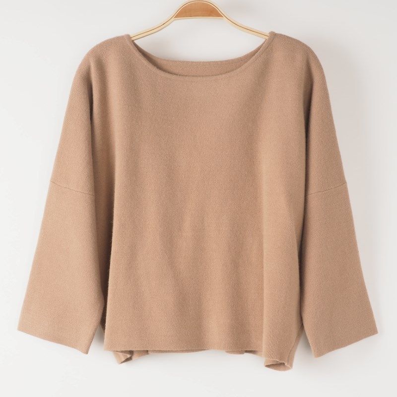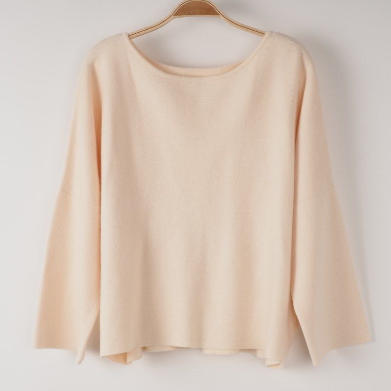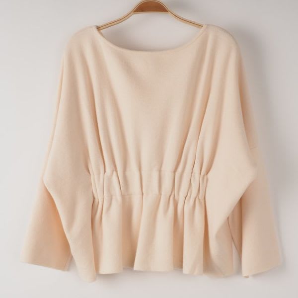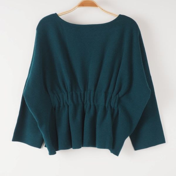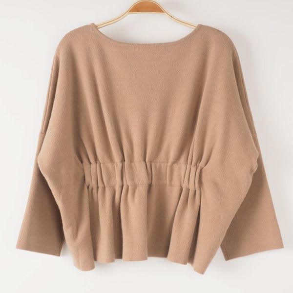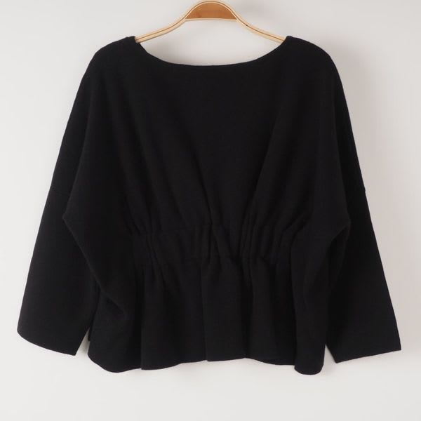 デコルテがきれいに見えるネックラインにバックのギャザーデザインがポイントのニット。