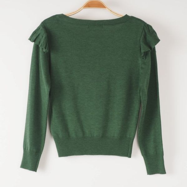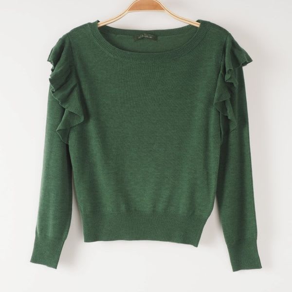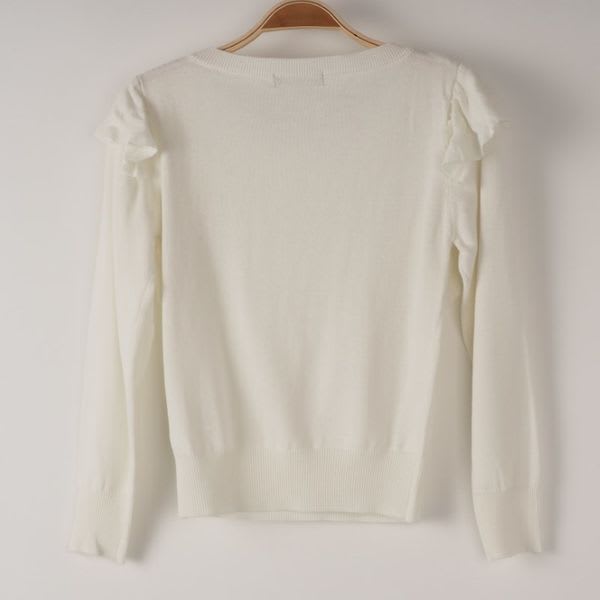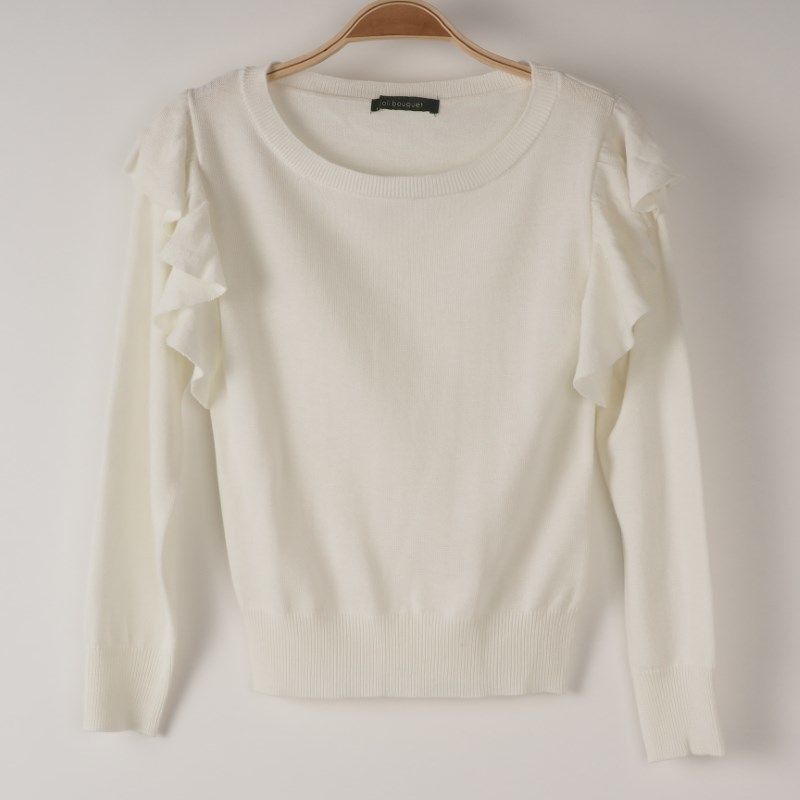 肩のフリルがポイントのニット。華奢なネックレスにテーパードパンツを合わせて甘辛ミックスコーデに、大ぶりのイヤリングフレアスカートを合わせてレディライクに。デニムと合わせてカジュアルスタイルも◎。