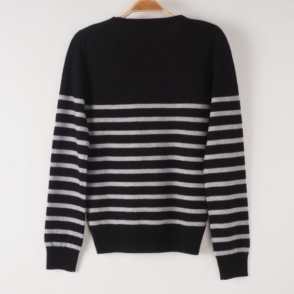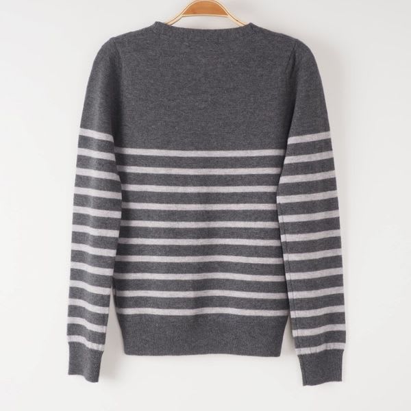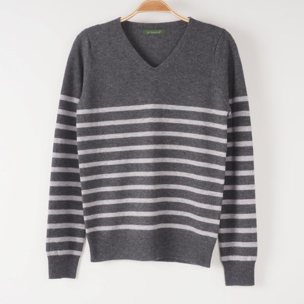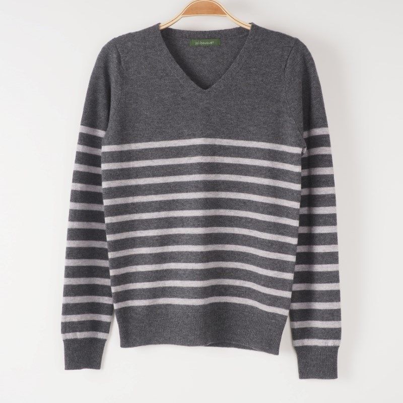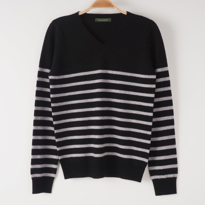 Vネックのボーダーニットはオンオフ問わず使える便利な一枚。テーパードパンツにパンプスを合わせてスッキリとしたオフィススタイルに、フレアスカートにスニーカーを合わせてカジュアルな着こなしも可愛いですよ。