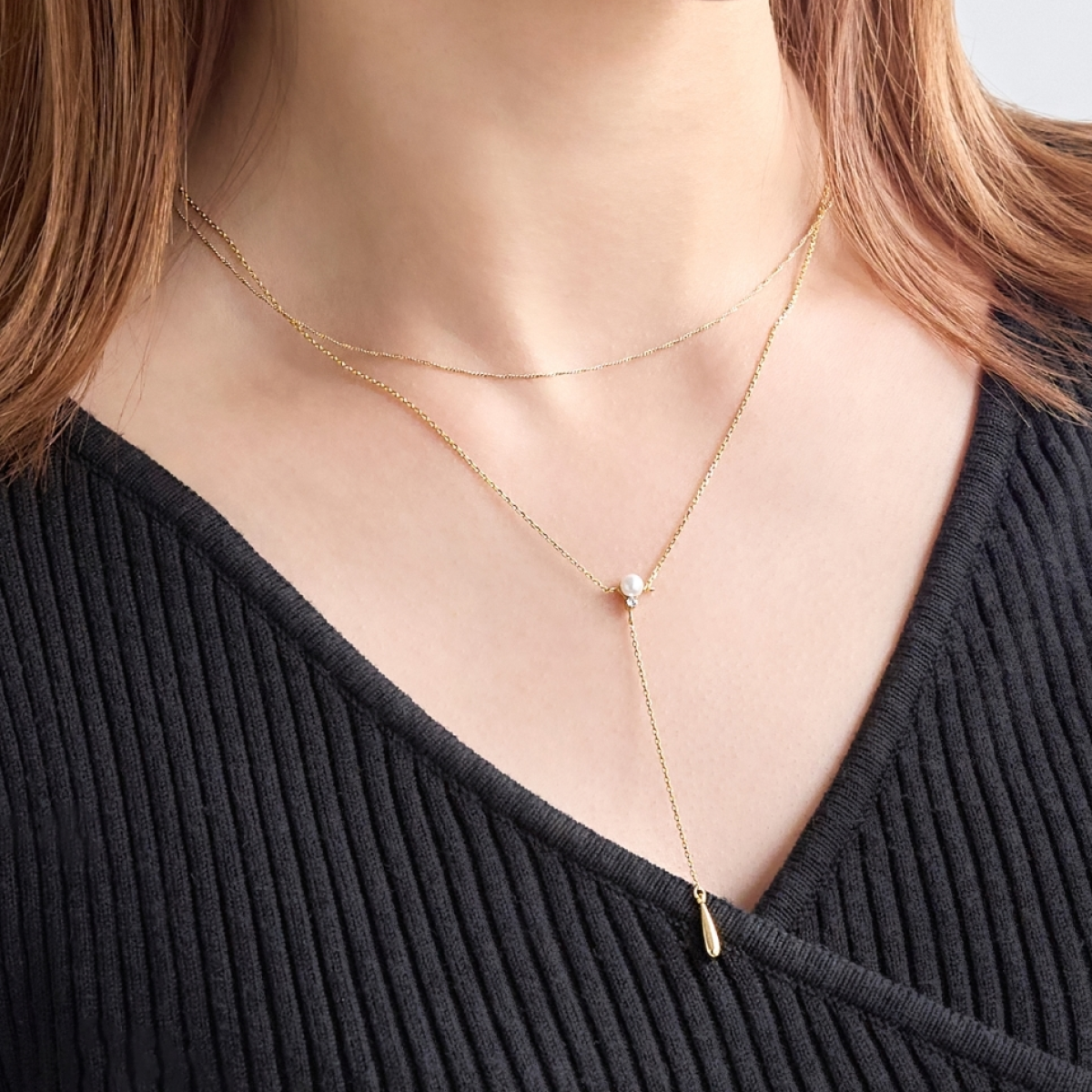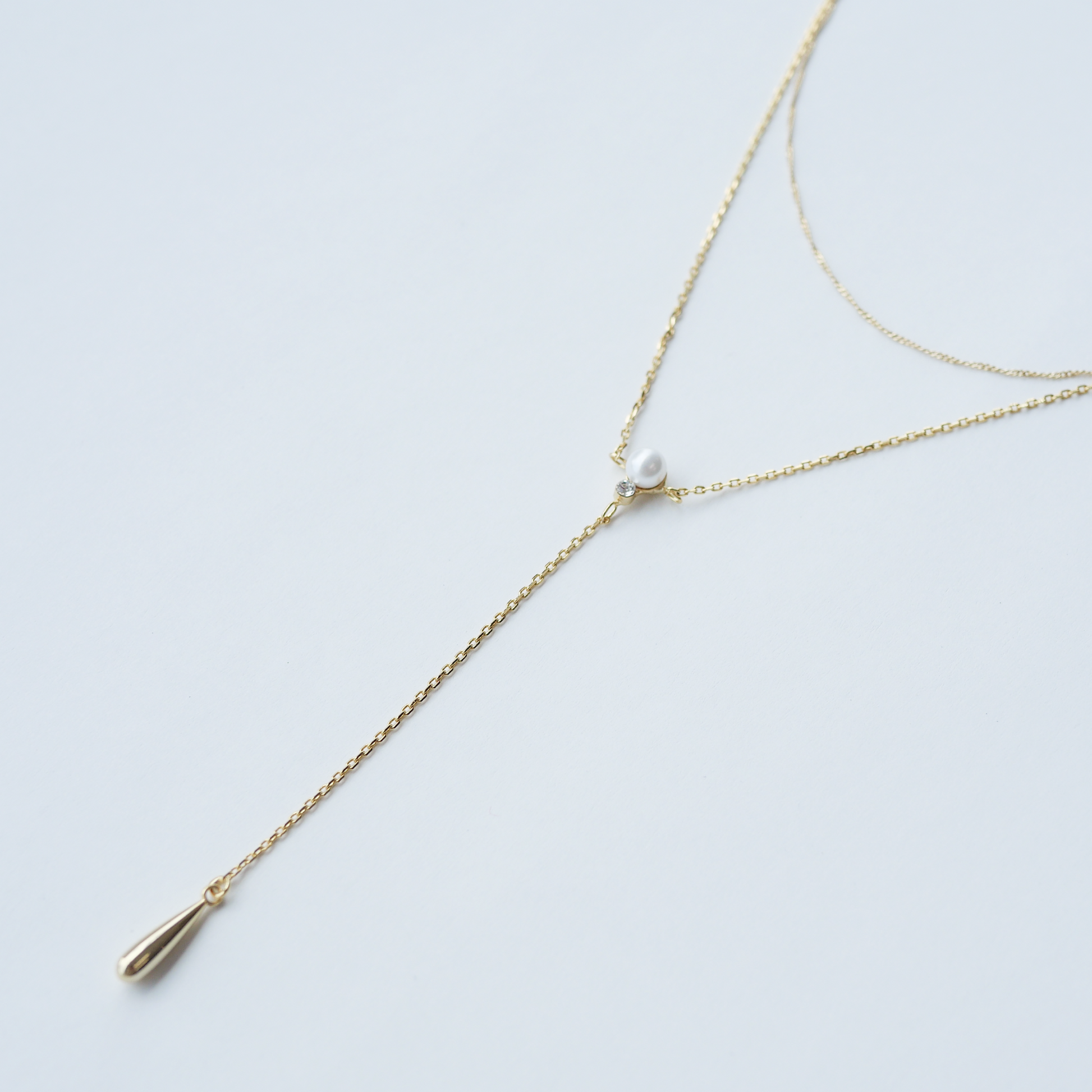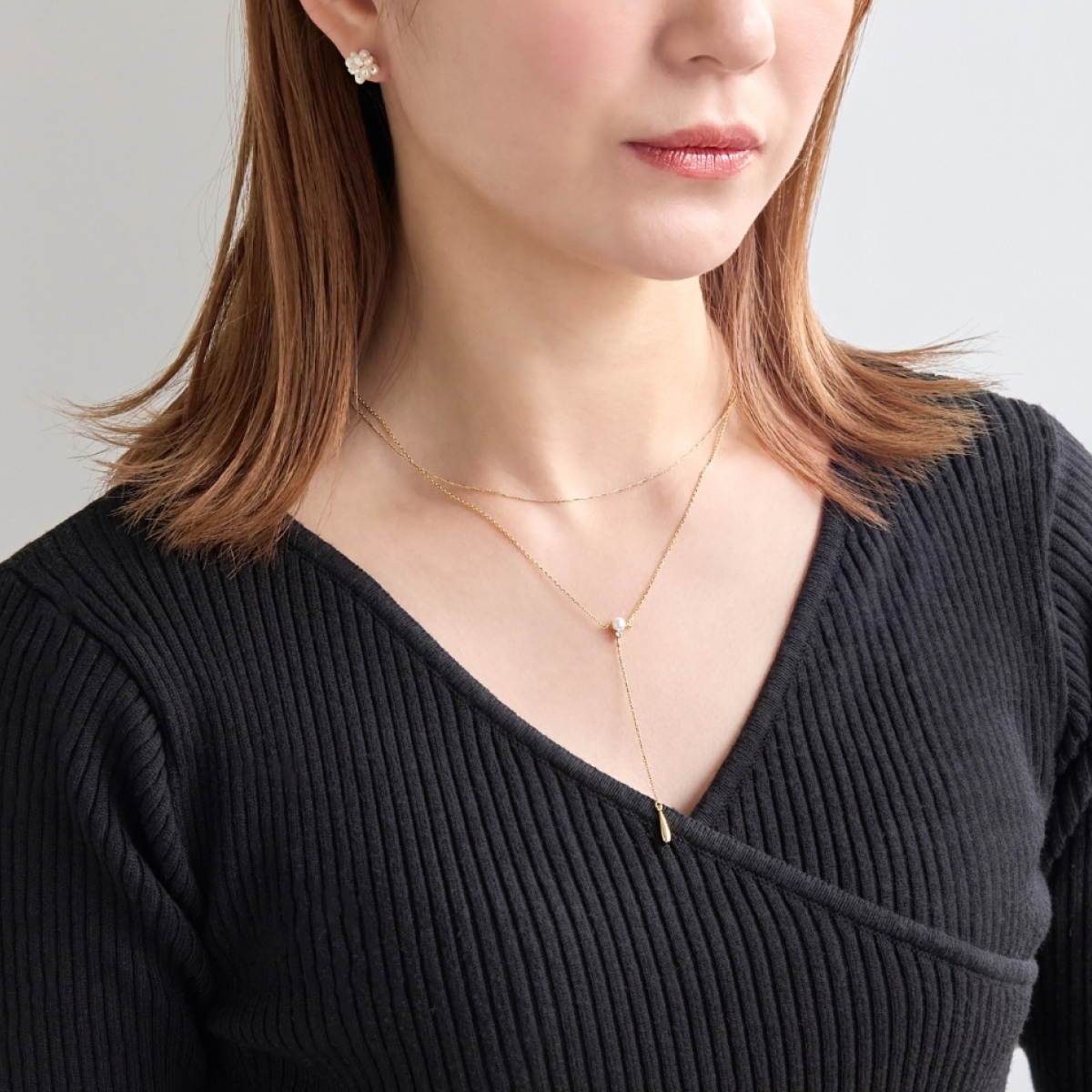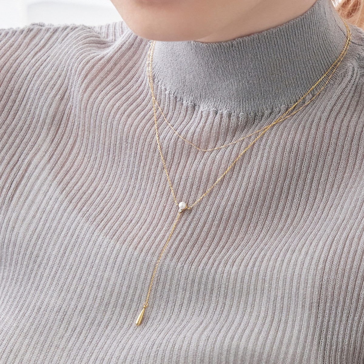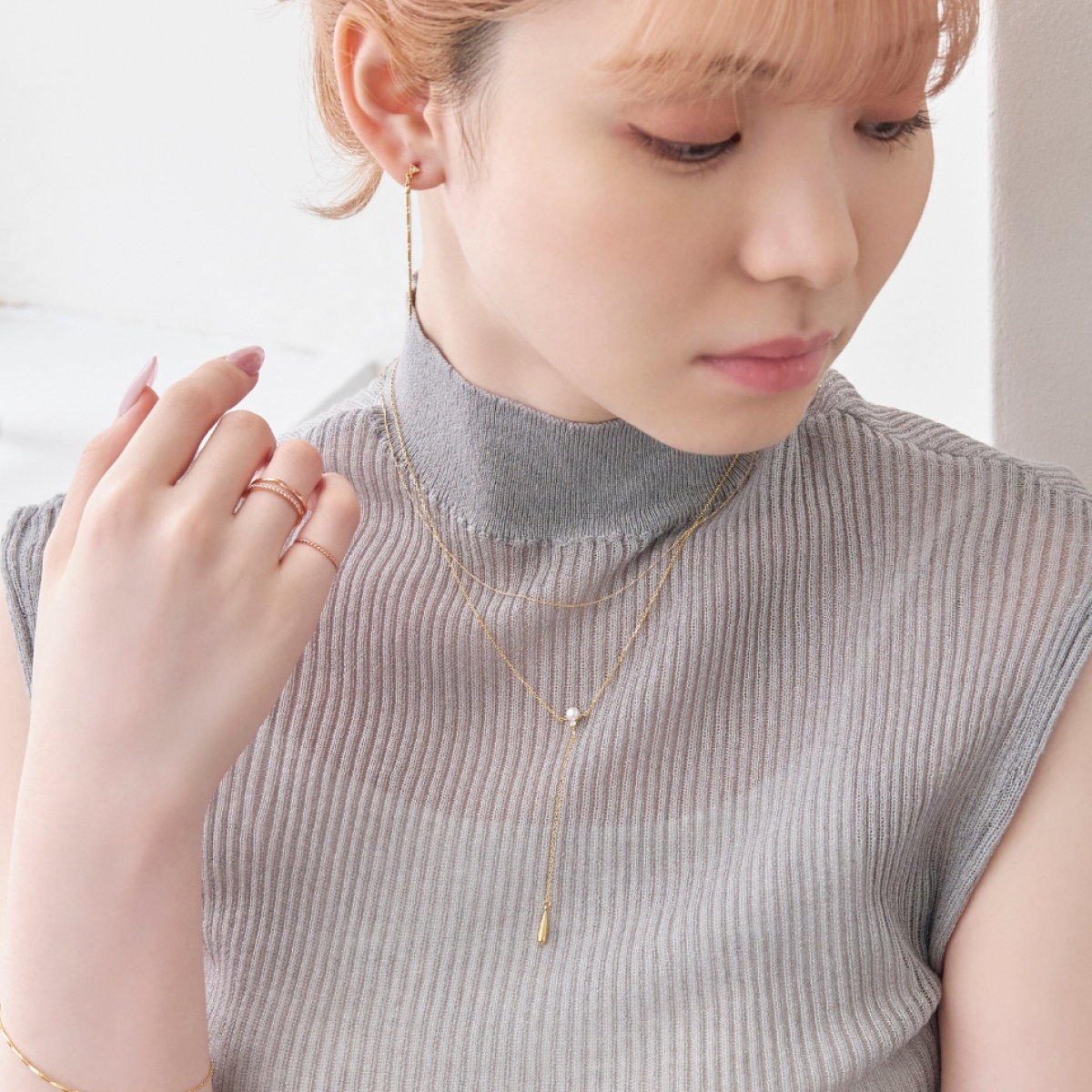 2種類のチェーンを組み合わせ、ひとつで重ね着けが完成するデザインです。