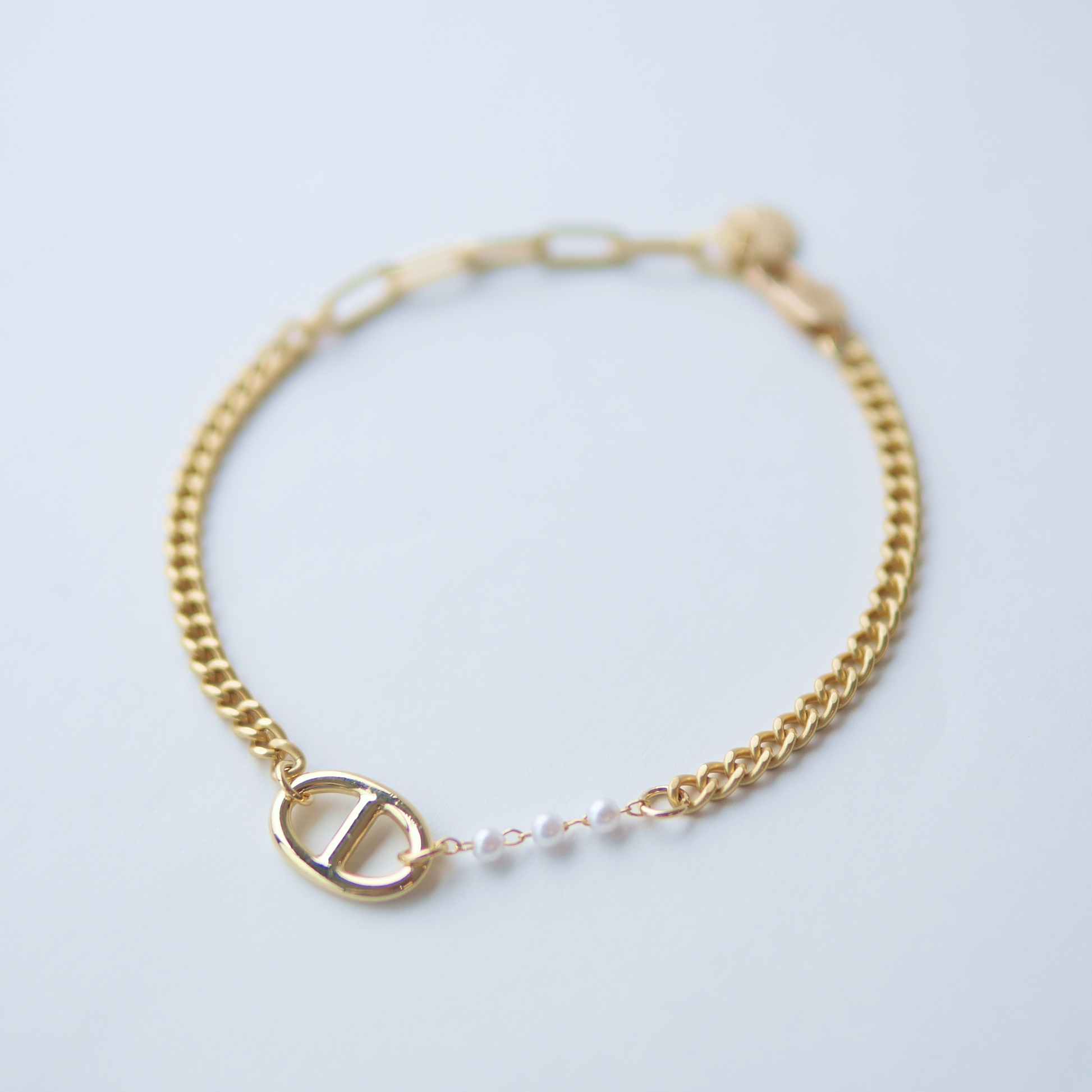 チェーンとパールの異素材を組み合わせた、程よくエッジの効いたブレスレットです。中央に配したアイコニックなモチーフがデザインのアクセントになり、手元にさりげない存在感を添えてくれます。