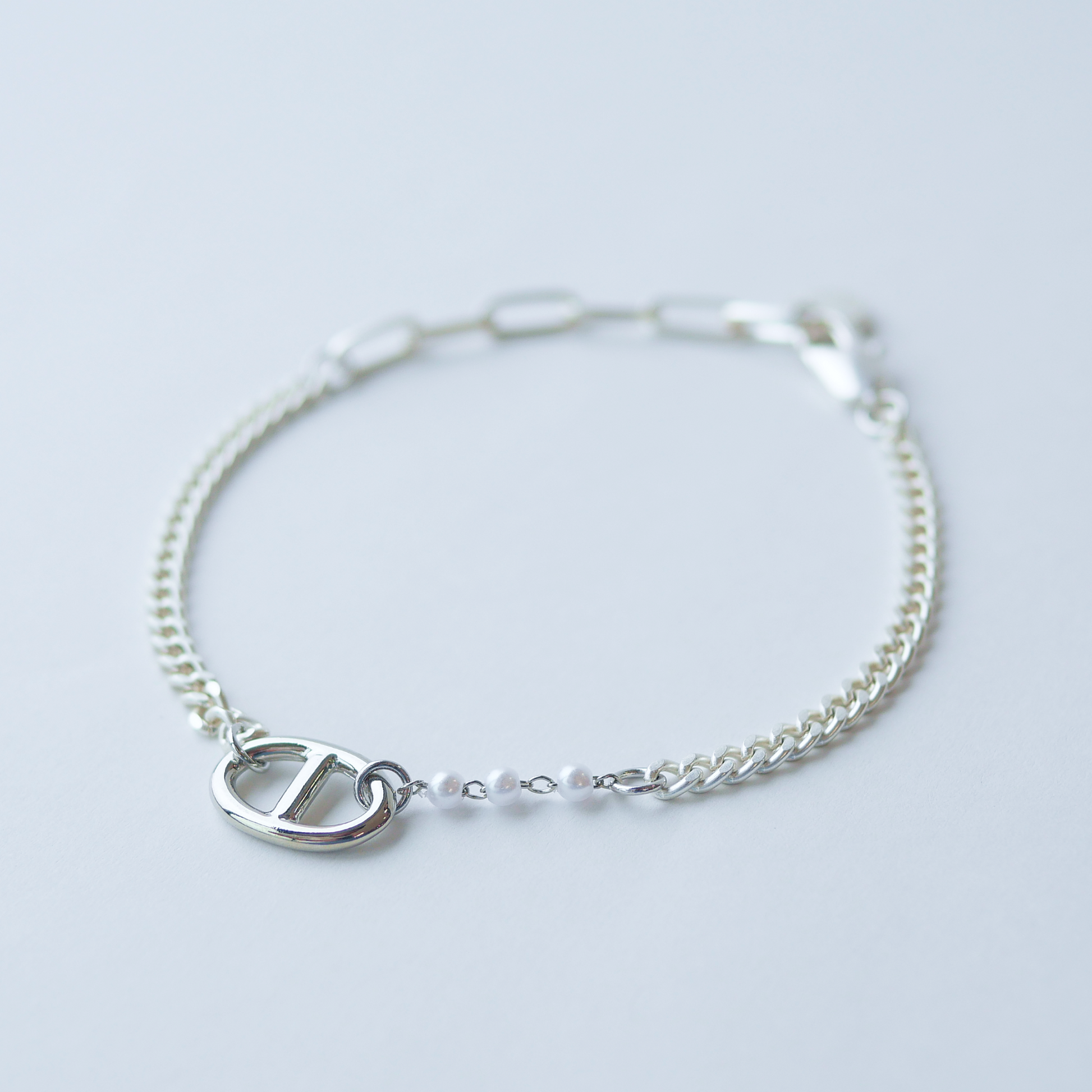 チェーンとパールの異素材を組み合わせた、程よくエッジの効いたブレスレットです。中央に配したアイコニックなモチーフがデザインのアクセントになり、手元にさりげない存在感を添えてくれます。