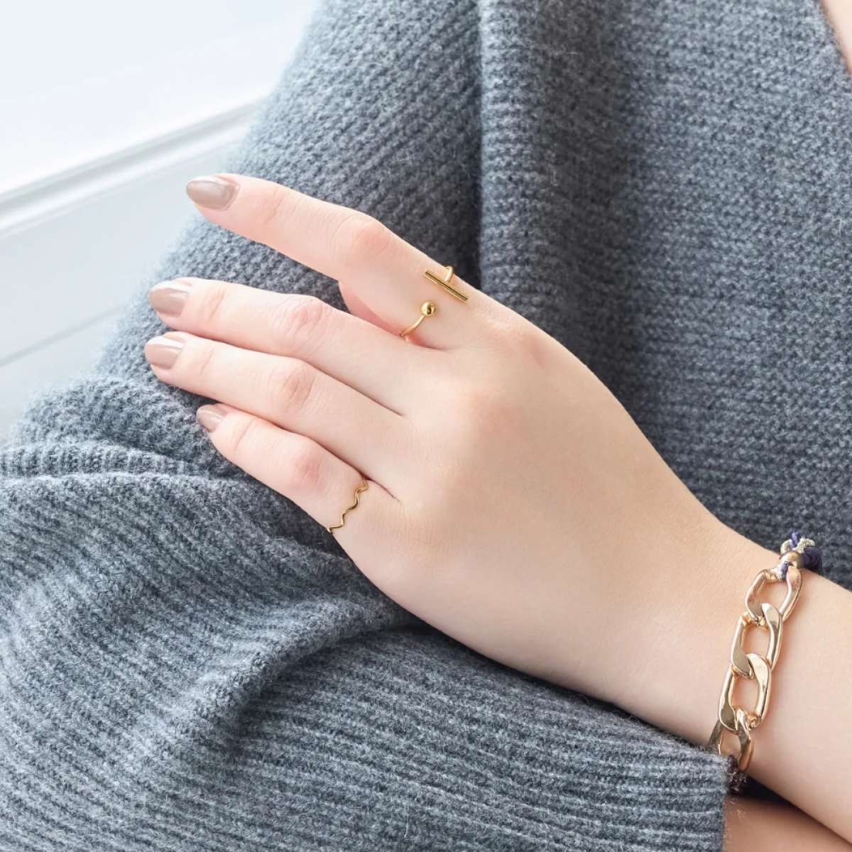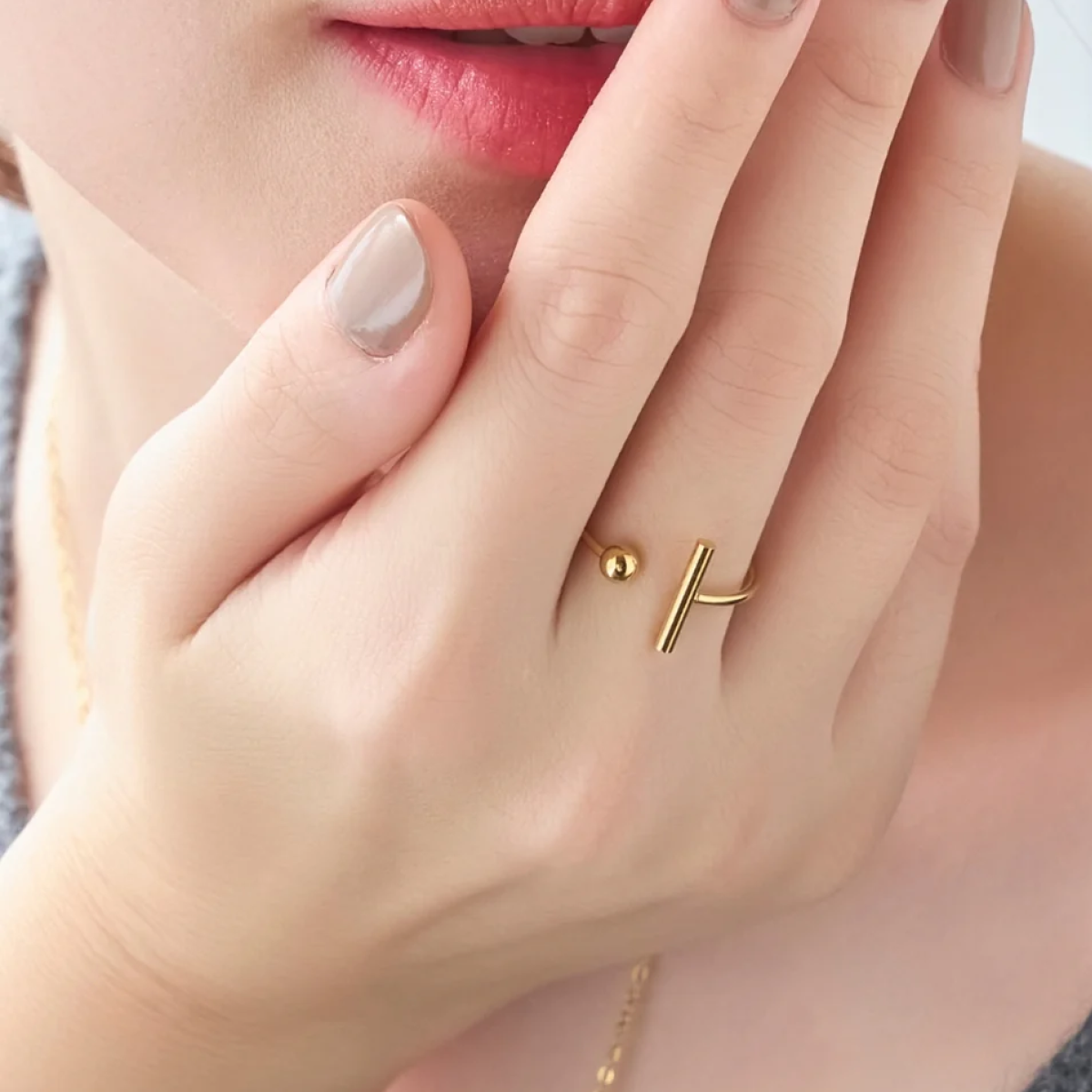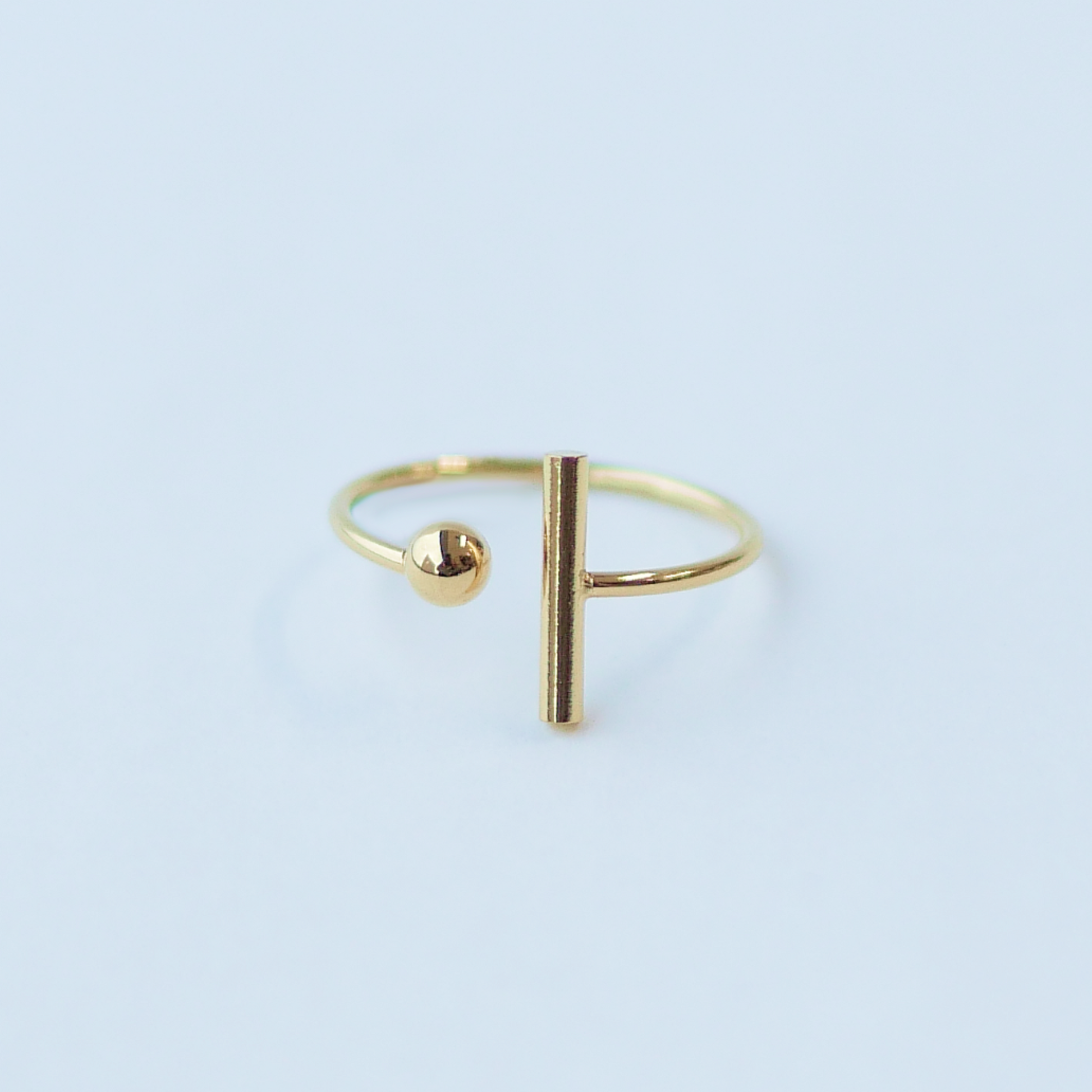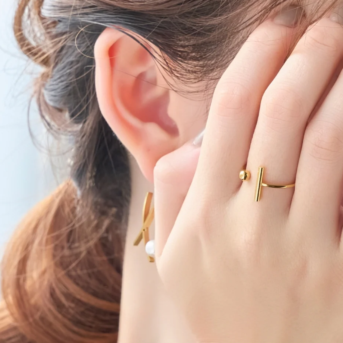 【向かい合うメタルボールとメタルスティックがポイントのリング】
