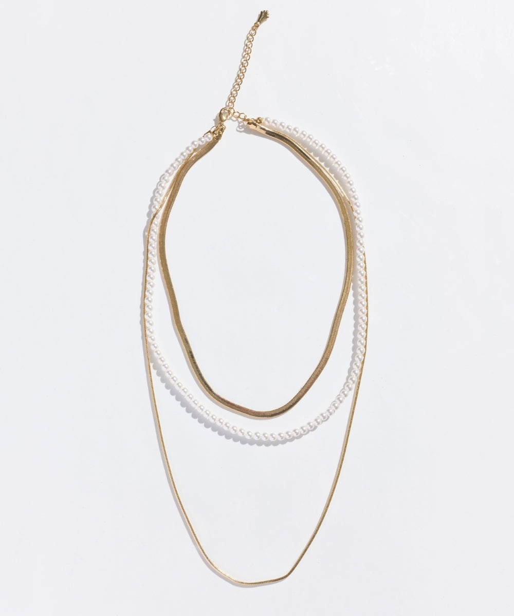 連パールと2種のデザインチェーンでまとめた、ワンアイテムでこなれたスタイルに導くネックレス。