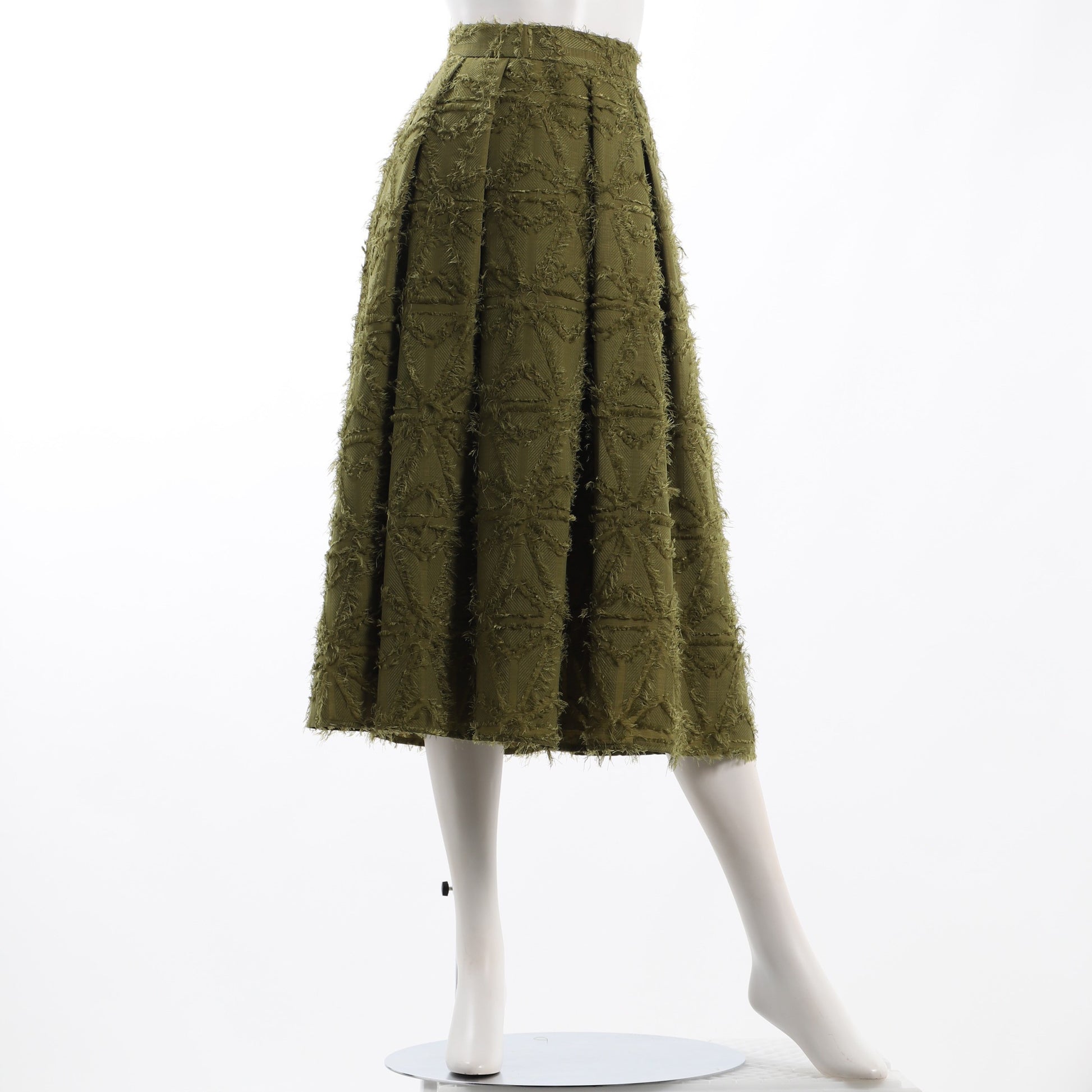 ネックラインのパイピングやパワショルデザインがポイントのカットソーと大柄のフリンジジャガードが特徴的なスカートでフェミニンコーデに。