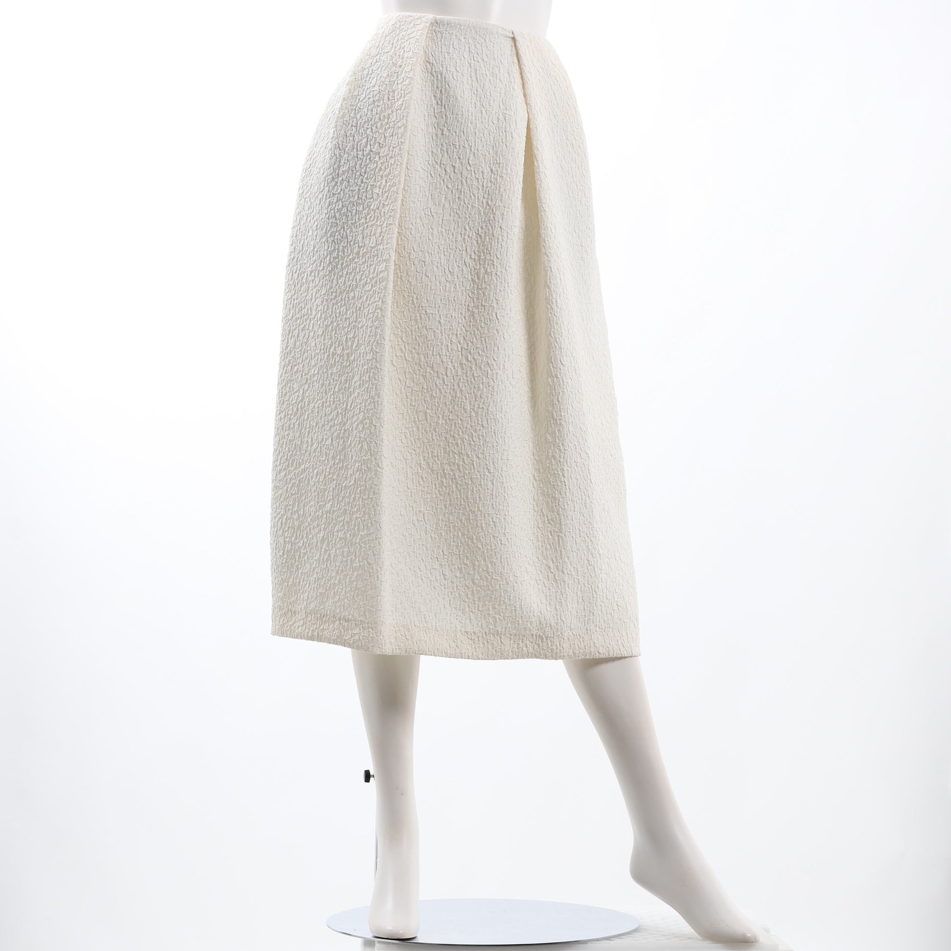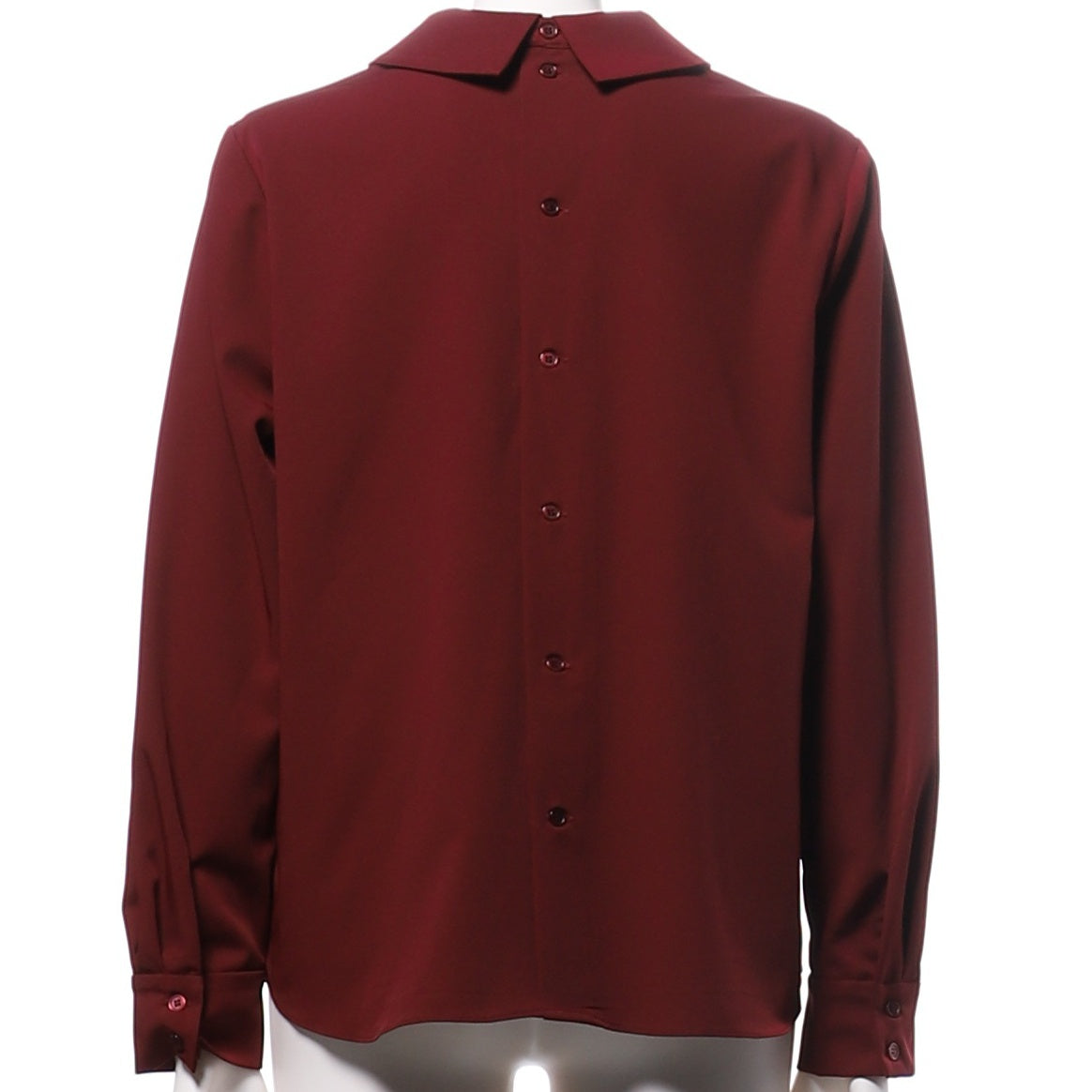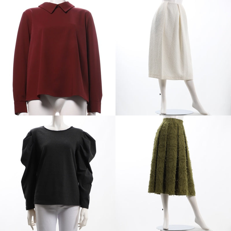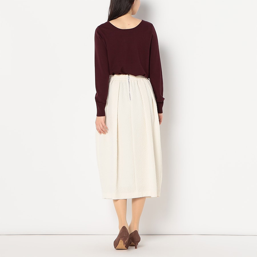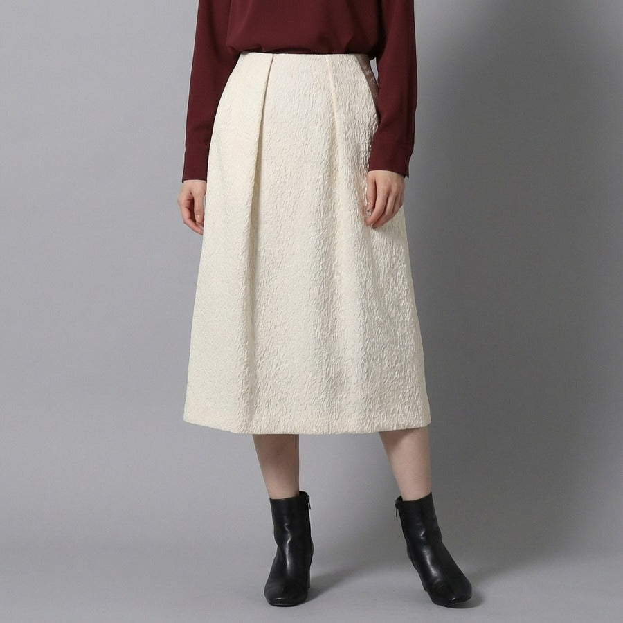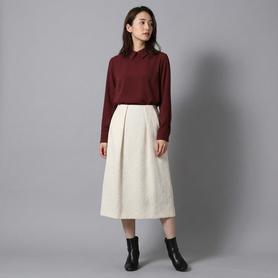バックボタンの襟付きブラウスとジャガード素材を使ったタックスカートを合わせたクラシカルスタイルです!