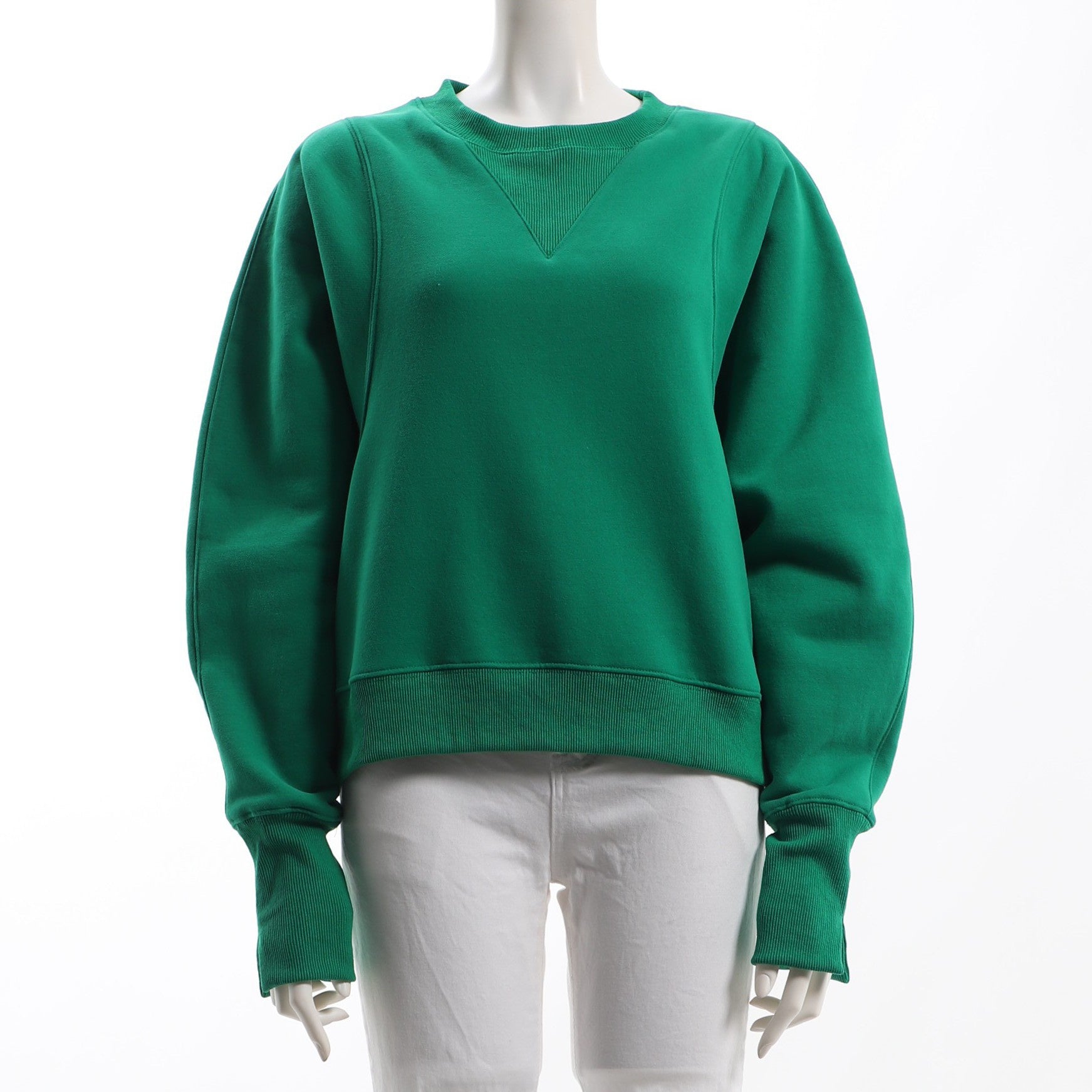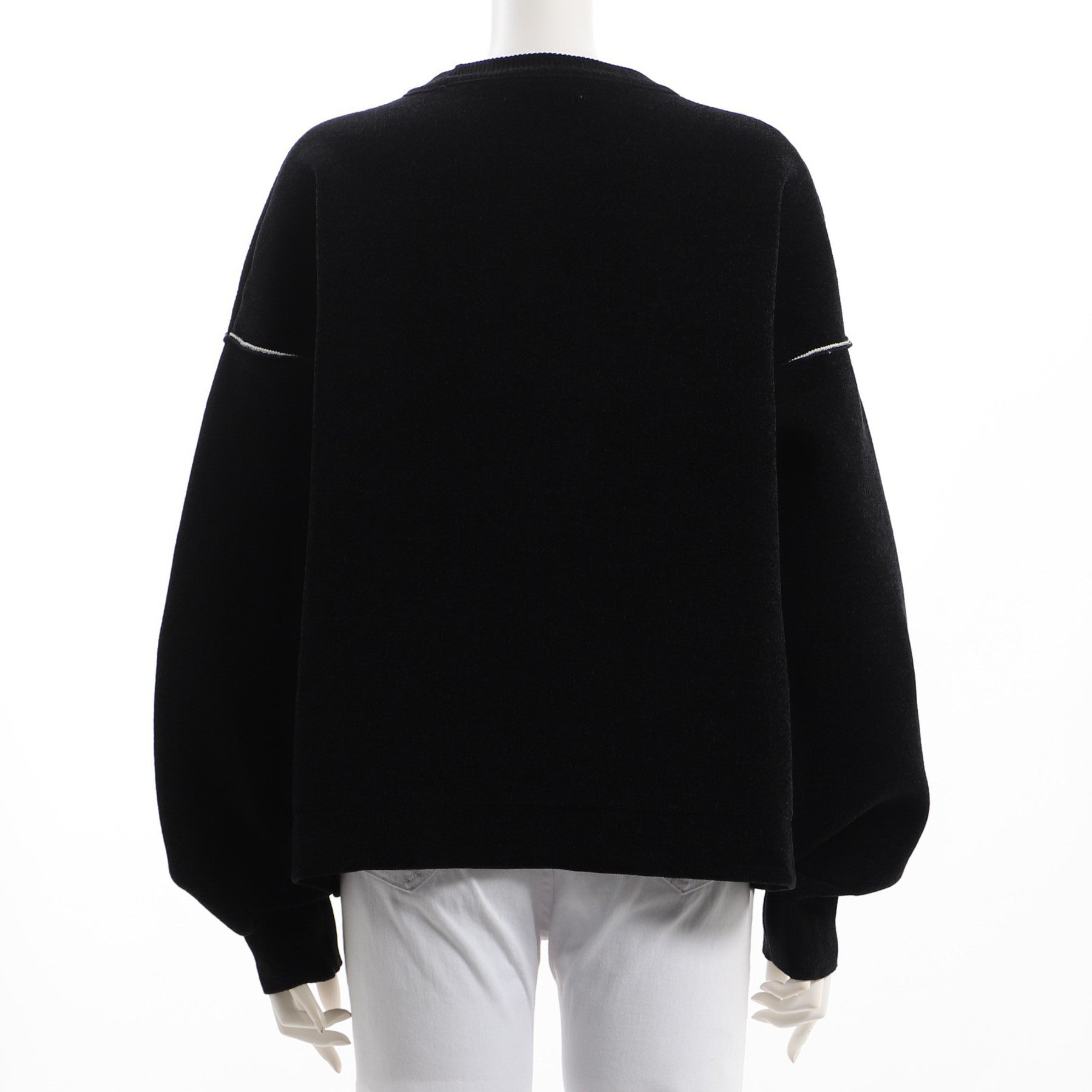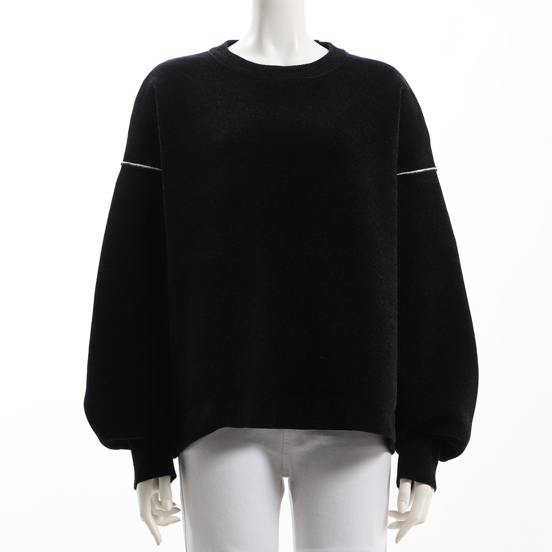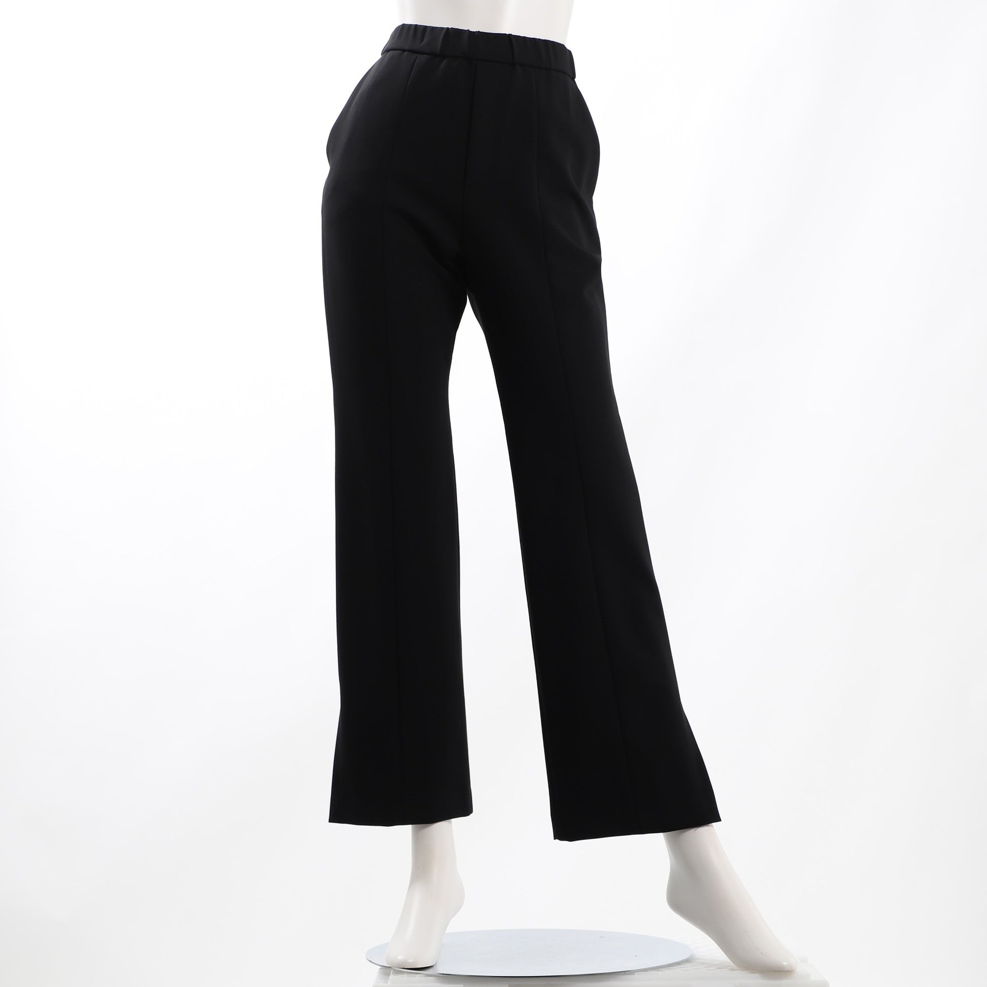 程よくボリュームのある袖のクルーネックカットソーとセンターシームやサイドスリットがポイントのストレートパンツモードコーデです。