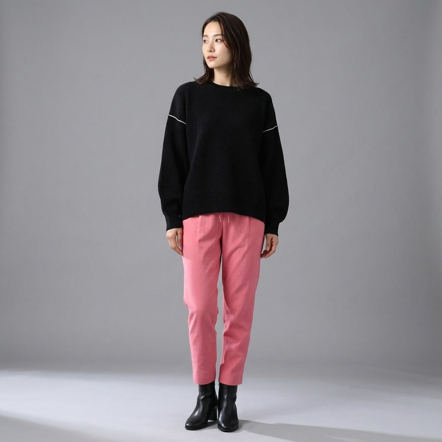 ボリュームスリーブのドロップショルダーニットとドロストデザインがポイントのテーパードパンツを合わせたカジュアルスタイルです!