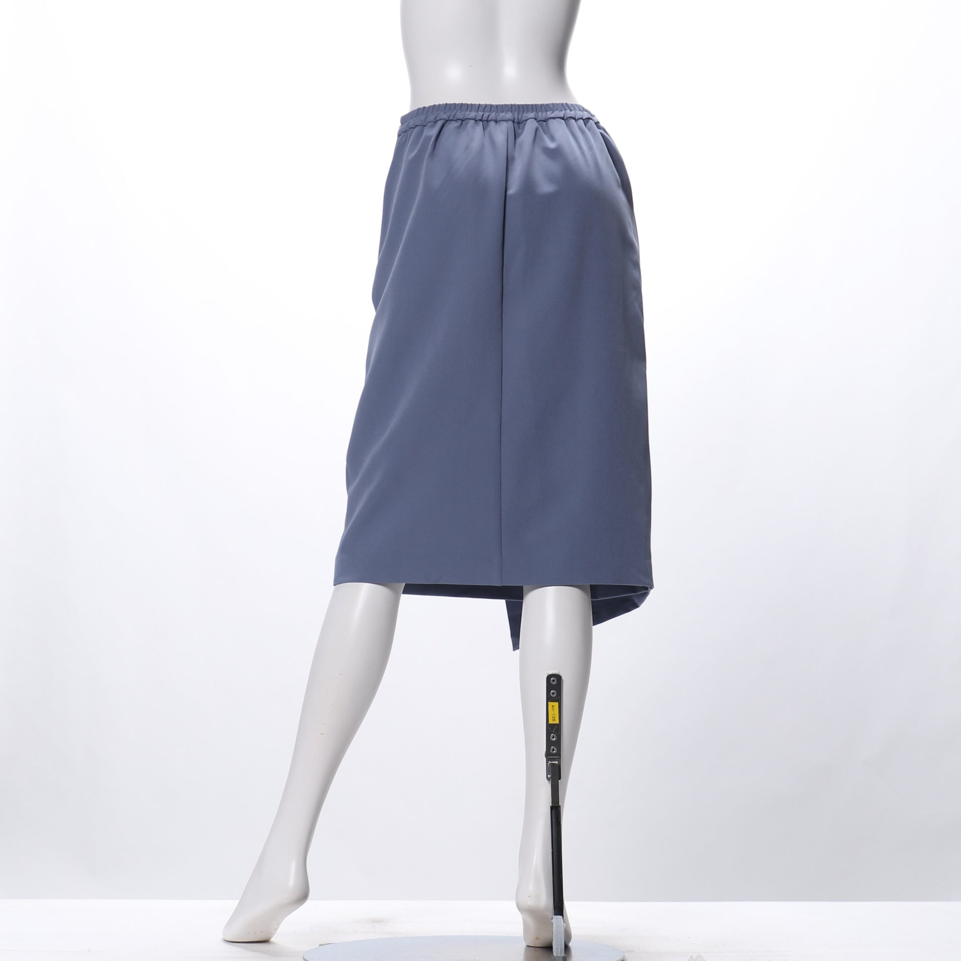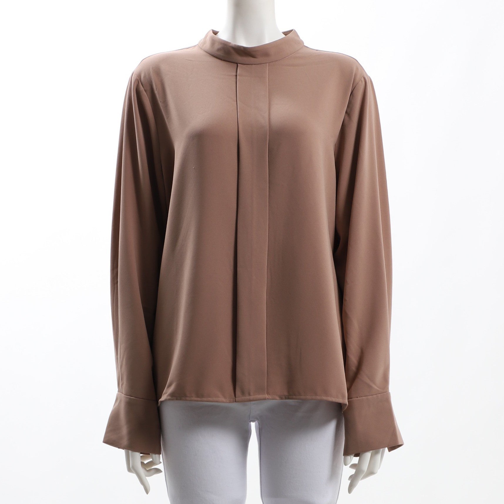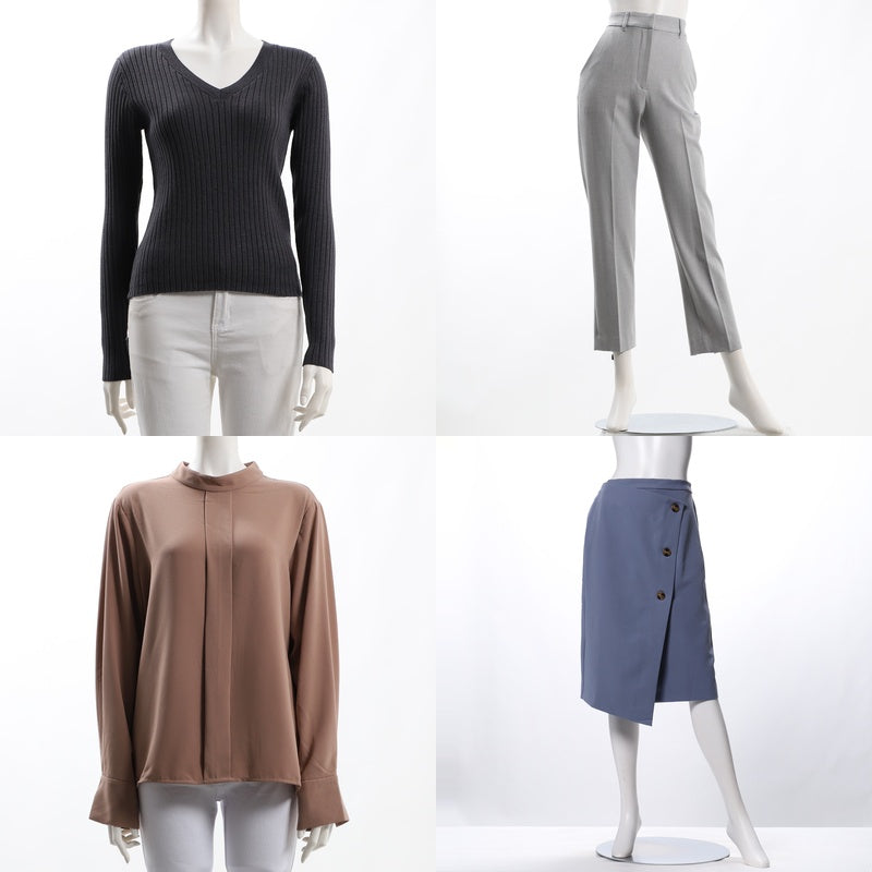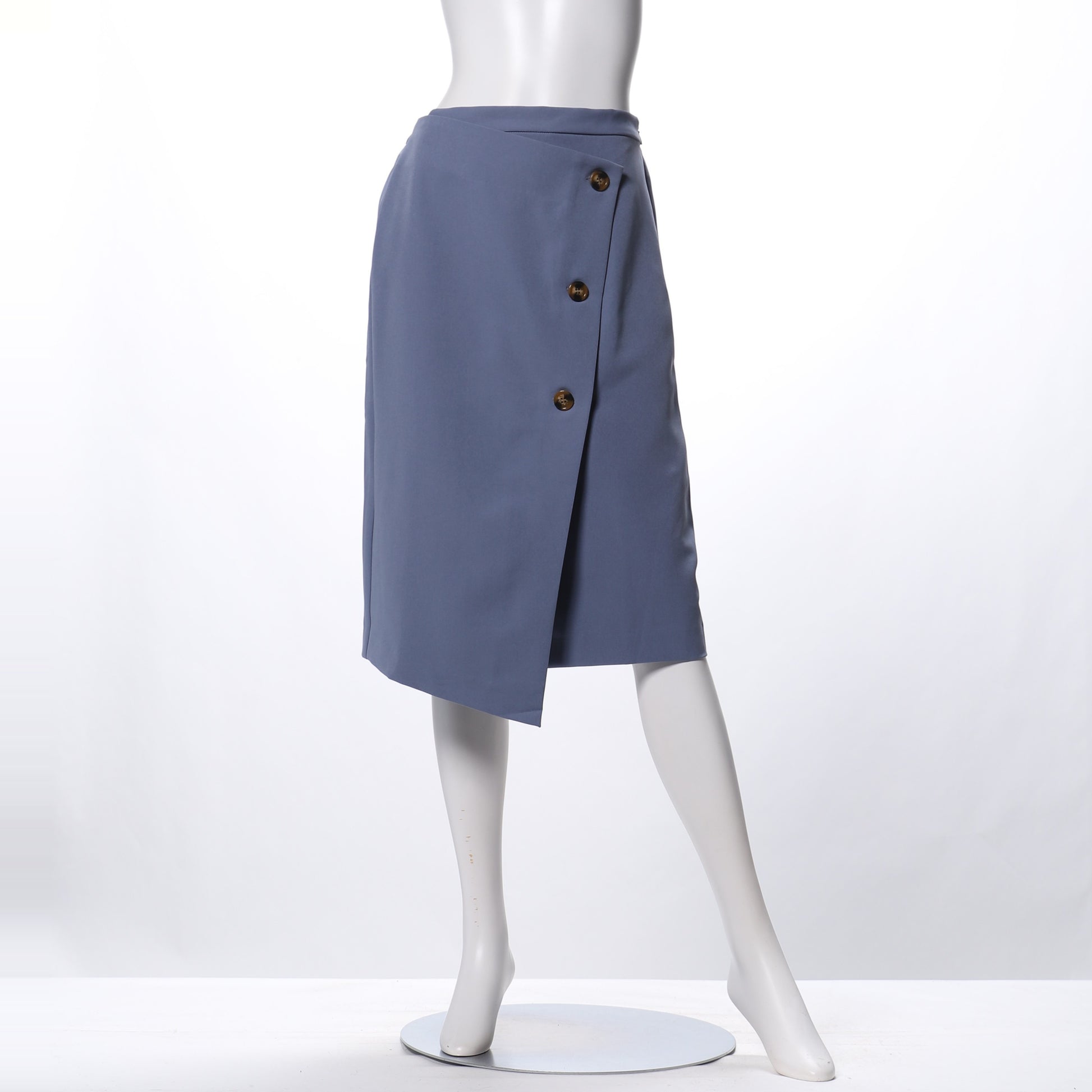 フロントのタックデザインがポイントのスタンドカラーブラウスとラップ風のタイトスカートでコンサバコーデに。