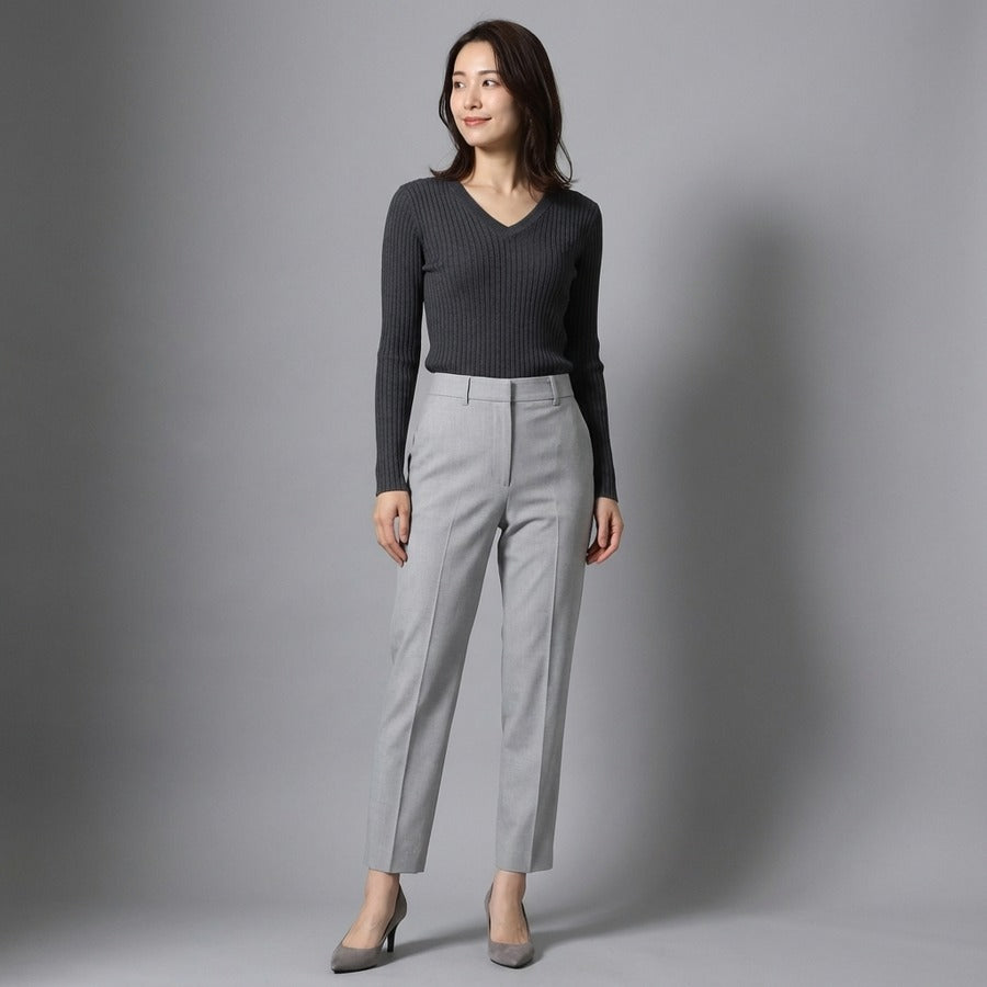 Vネックリブニットとウエストゴム入りで履きやすいポケット付きのテーパードパンツを合わせたクールスタイルです!
