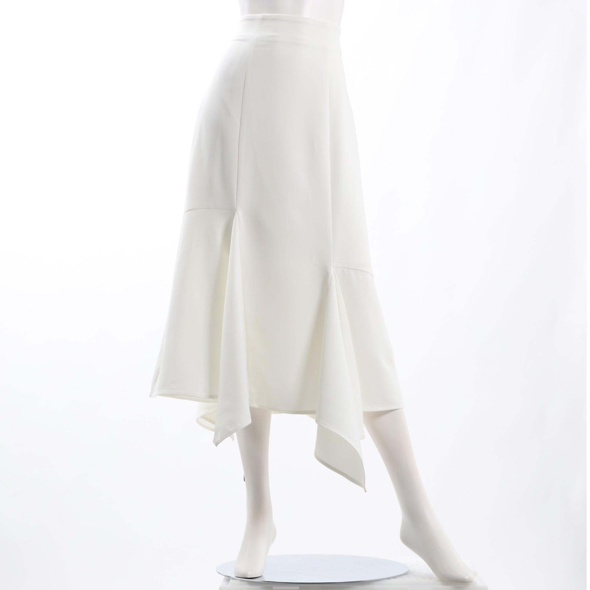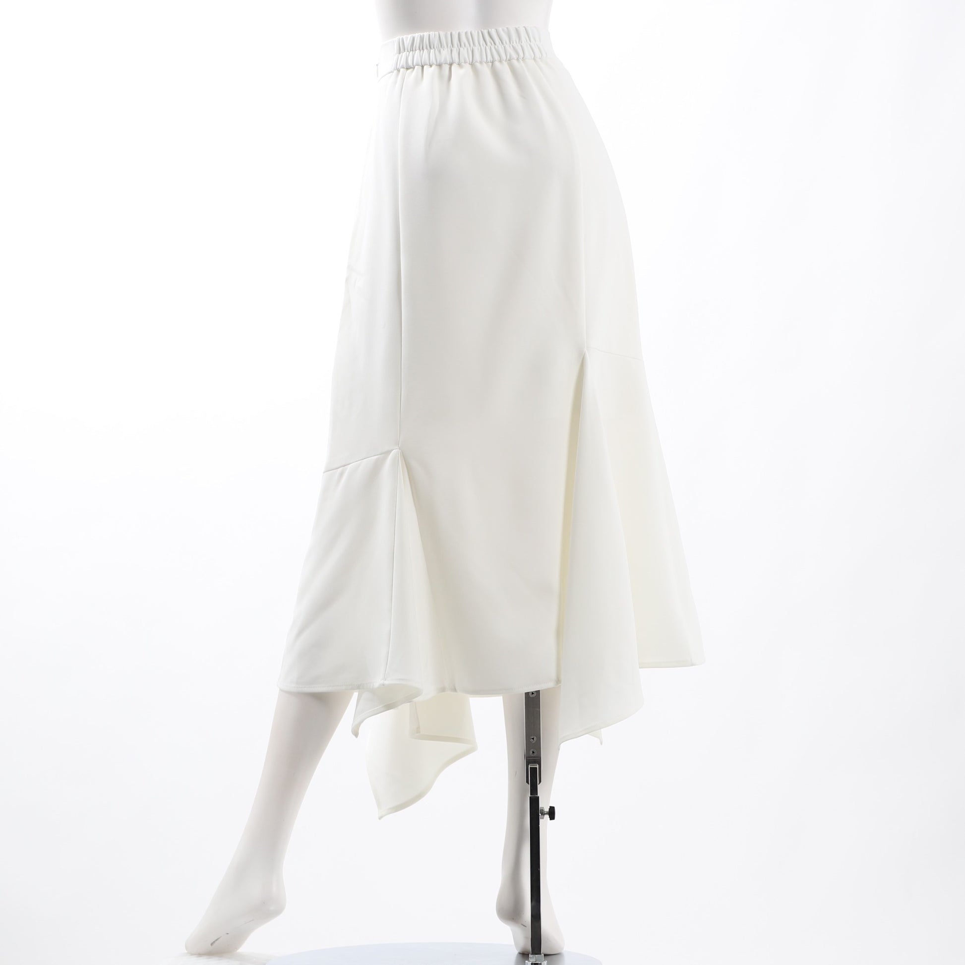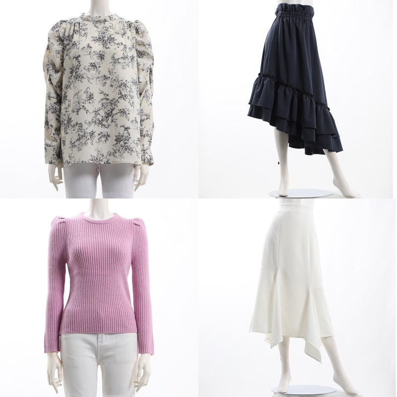 パフスリーブデザインのリブニットとイレギュラーヘムデザインのAラインスカートでレディライクコーデに。