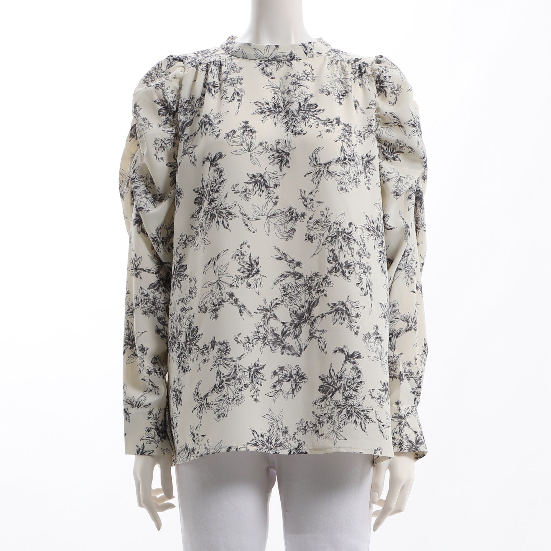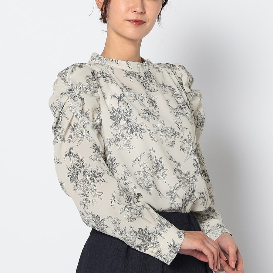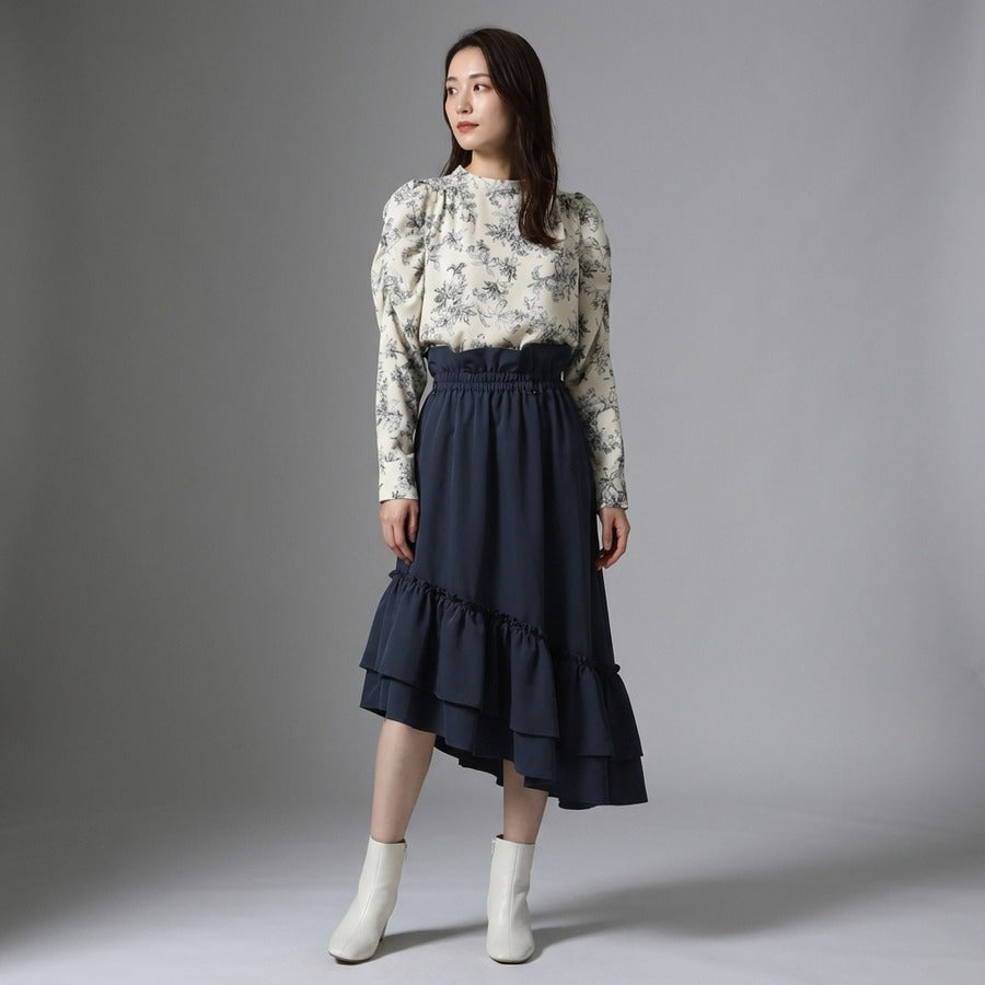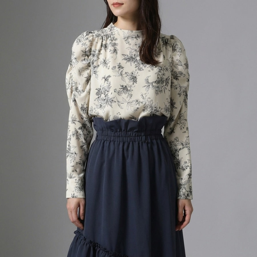 パワショルデザインの花柄スタンドカラーブラウスとアシンメトリーのスカートを合わせたフェミニンスタイルです!