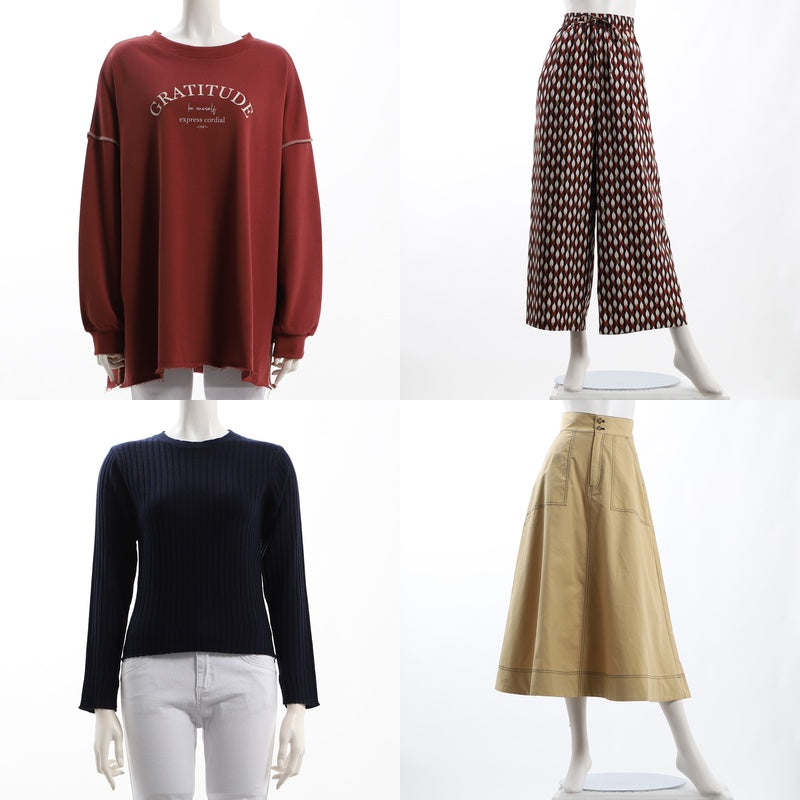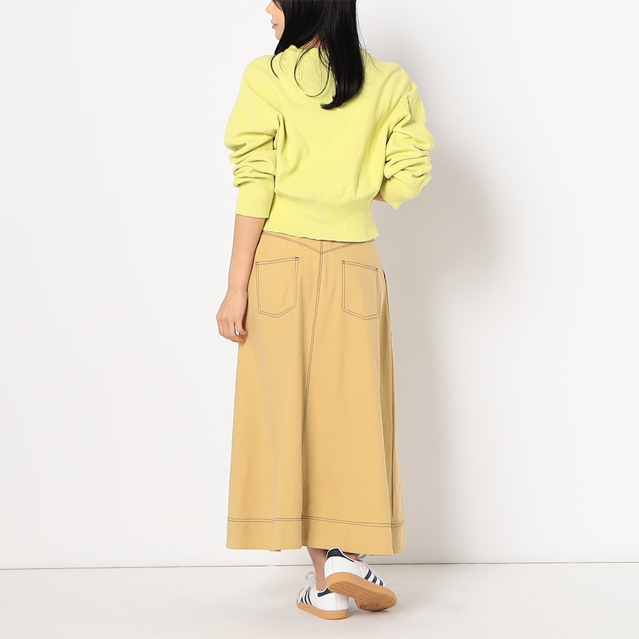 シンプルなクルーネックのリブニットとステッチデザインがポイントのハイウエストAラインスカートで大人かわいいコーデに。