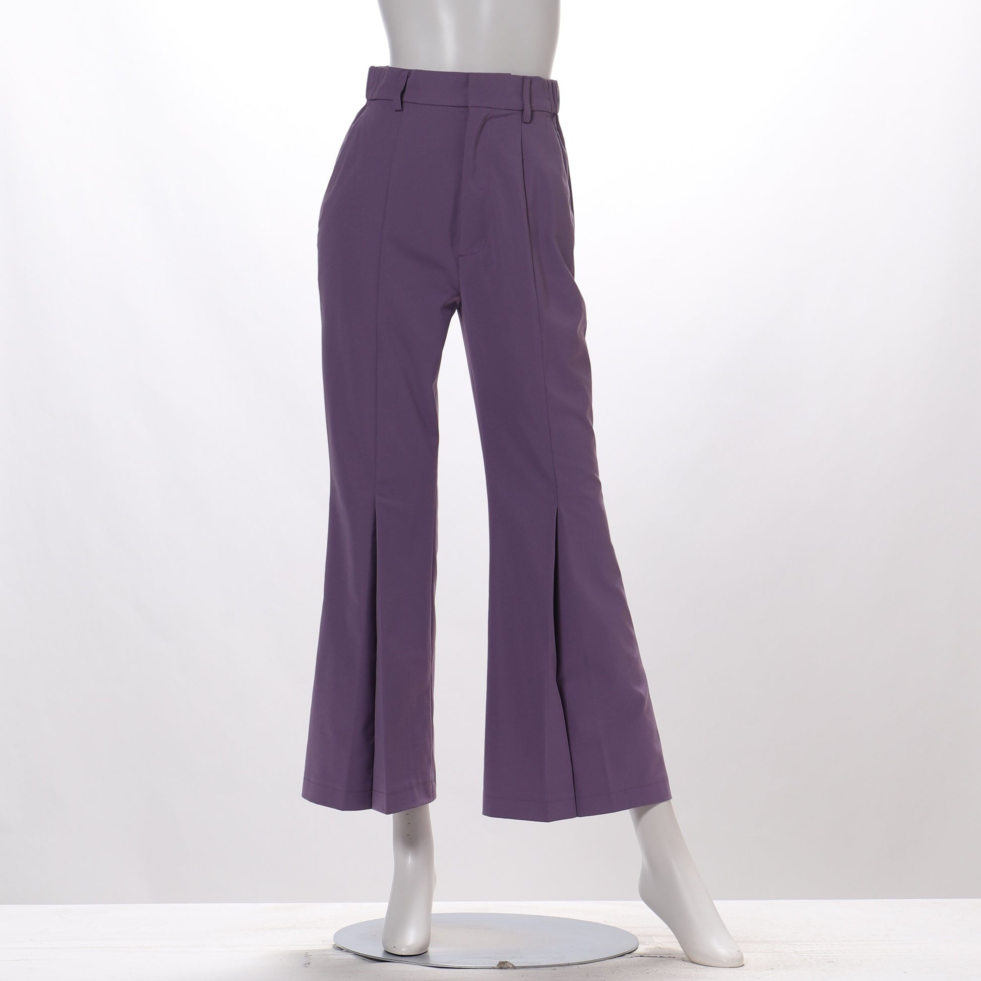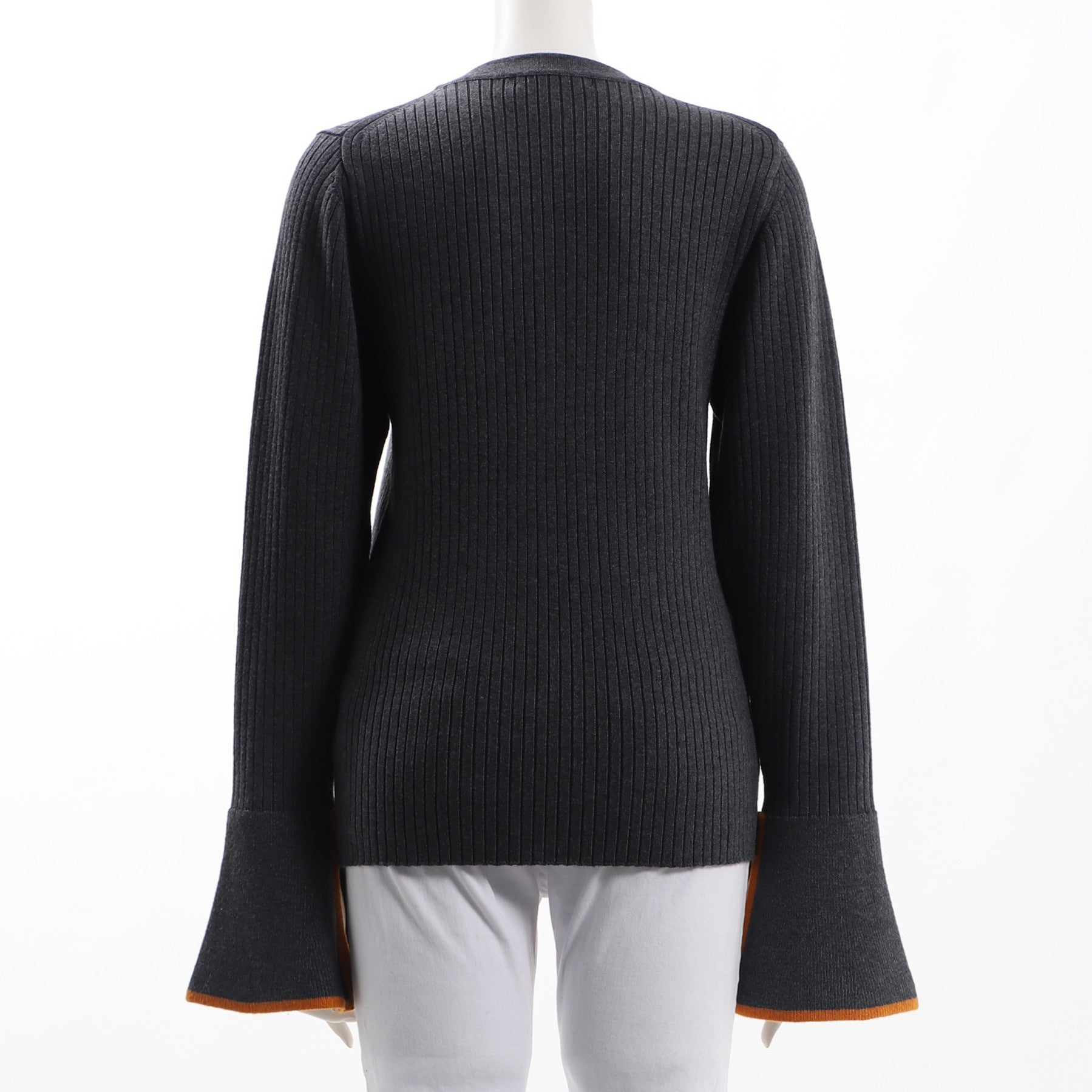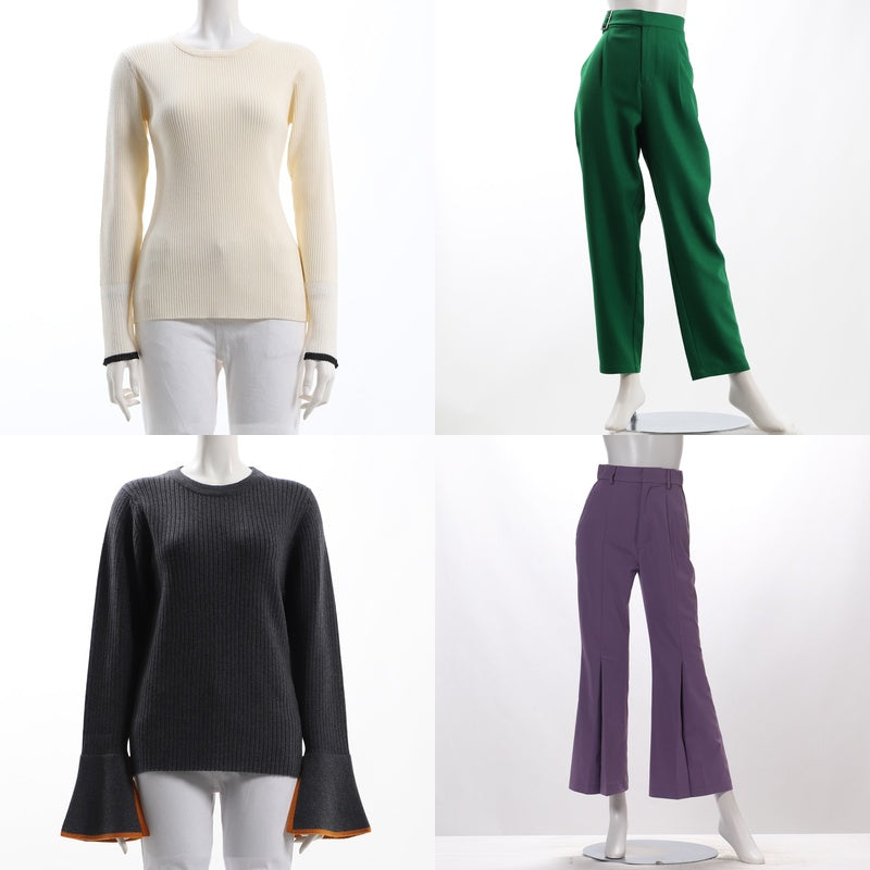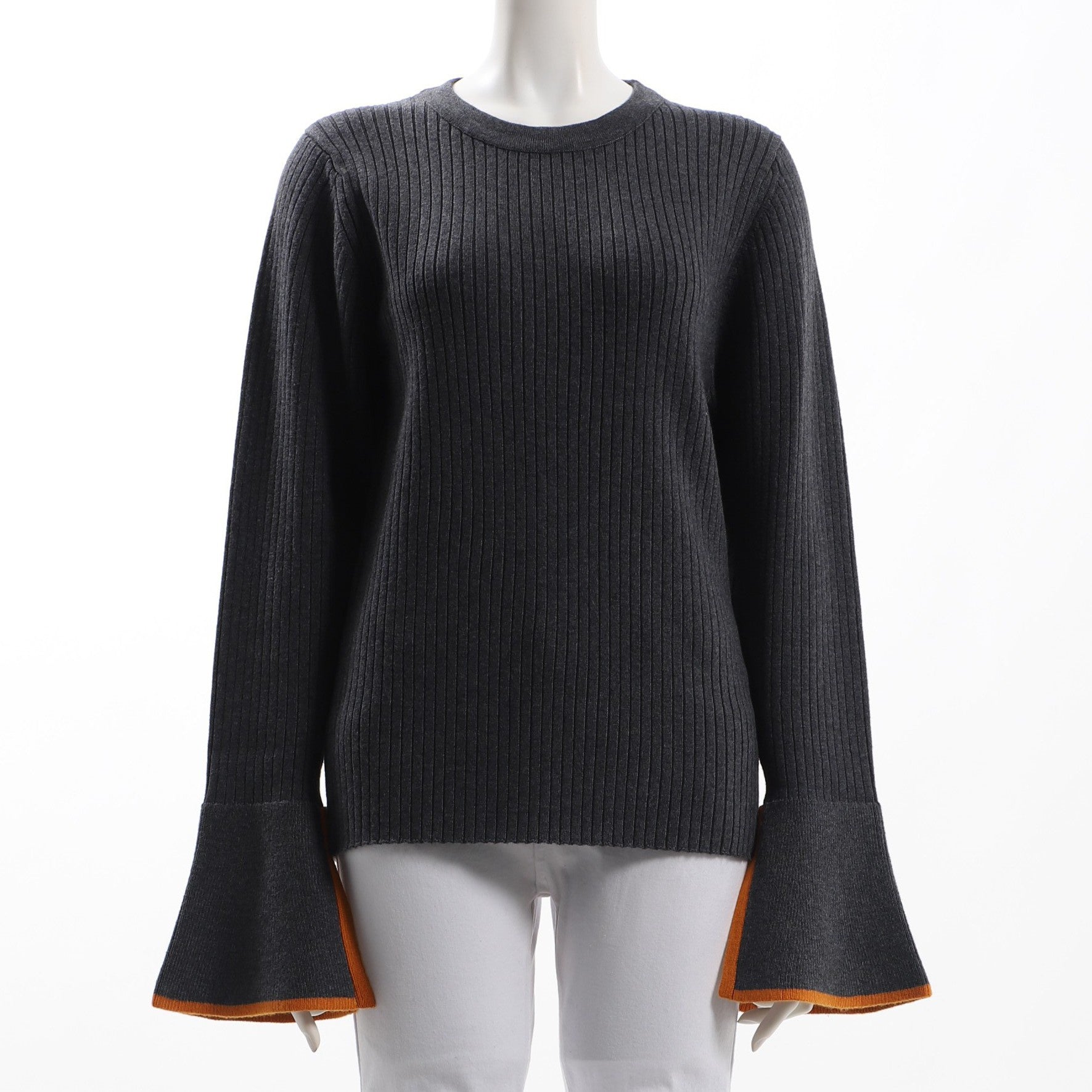 バイカラーのフレアスリーブが特徴のリブニットと裾のデザインが特徴的なフレアパンツでモードコーデに。