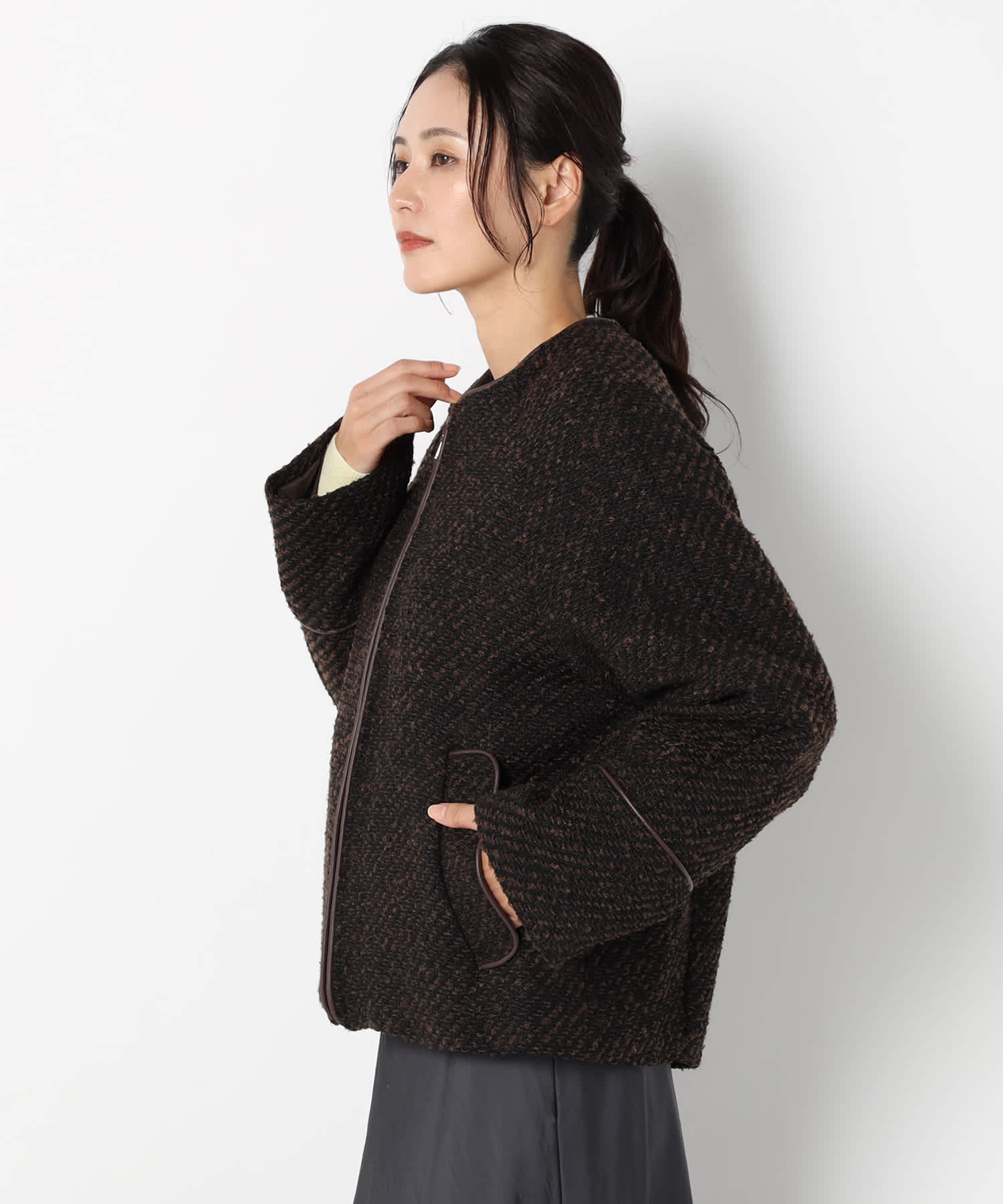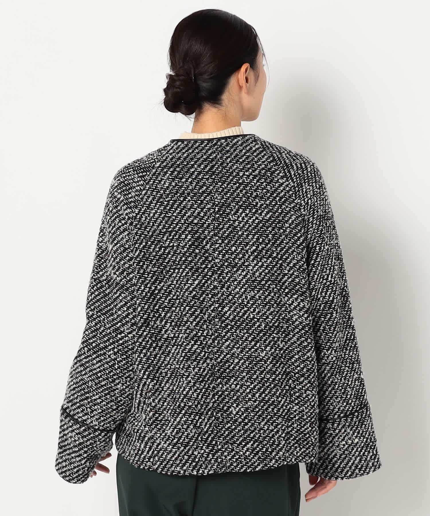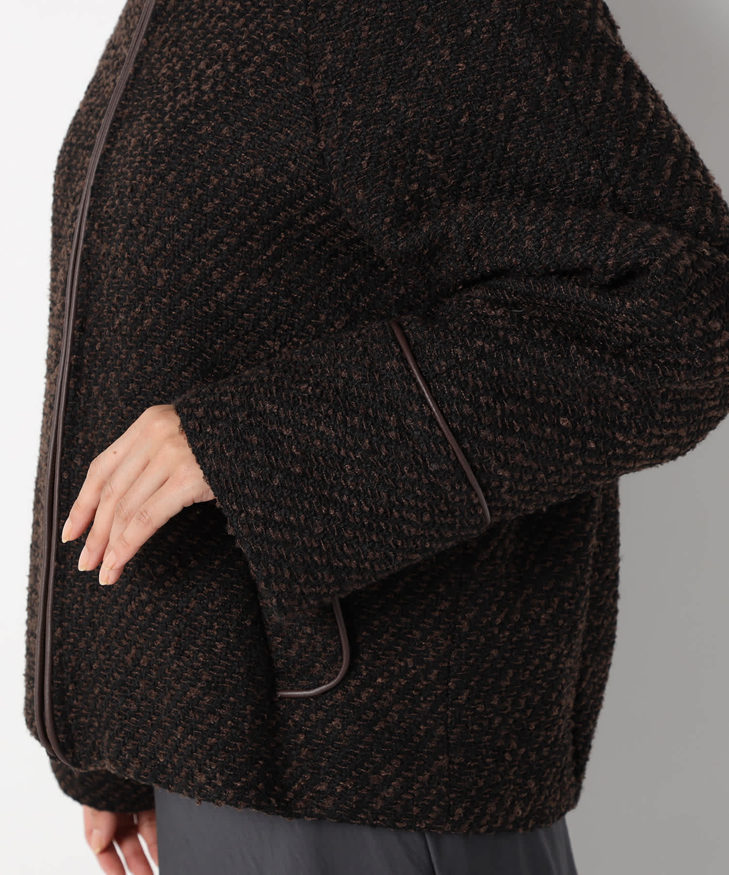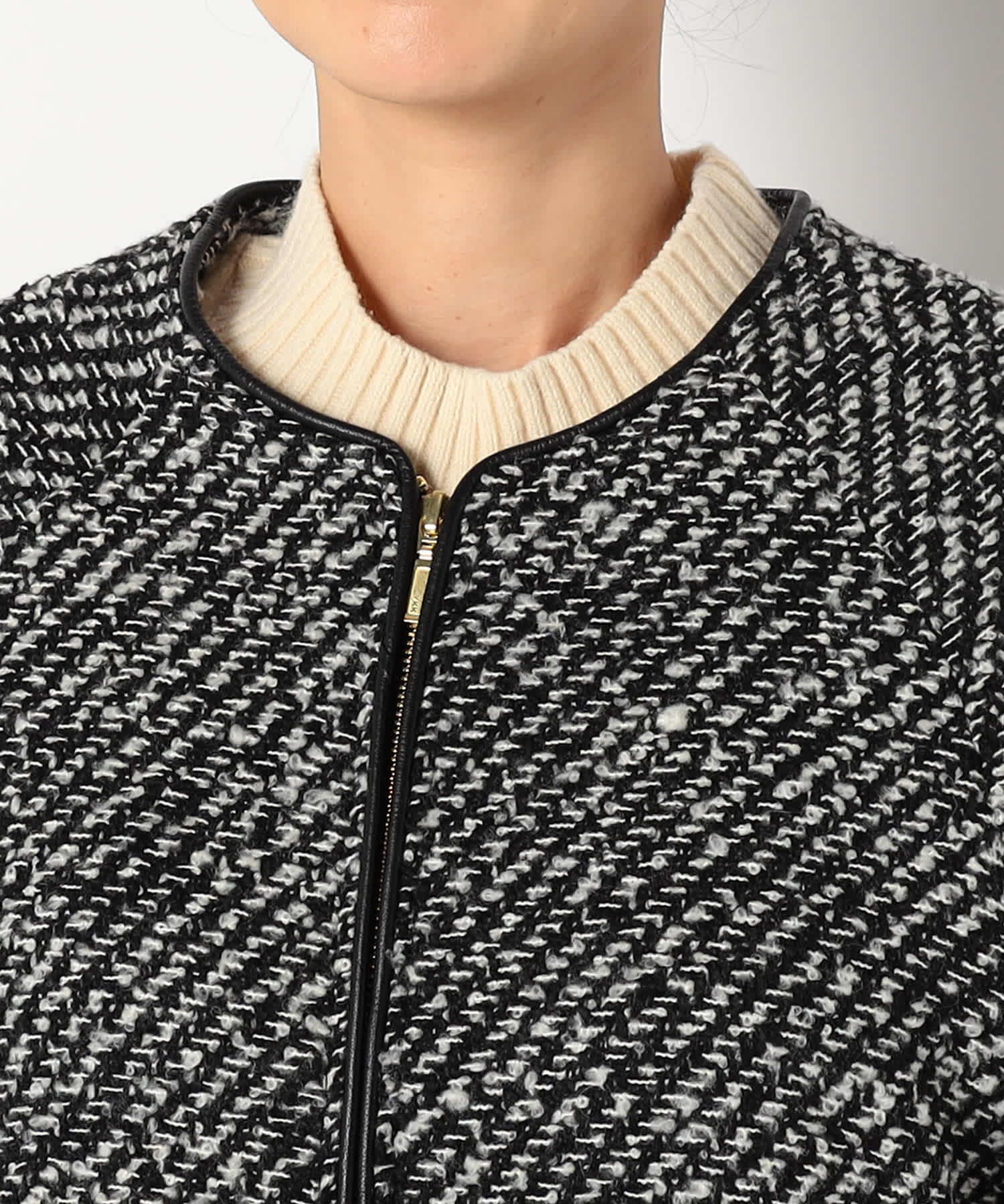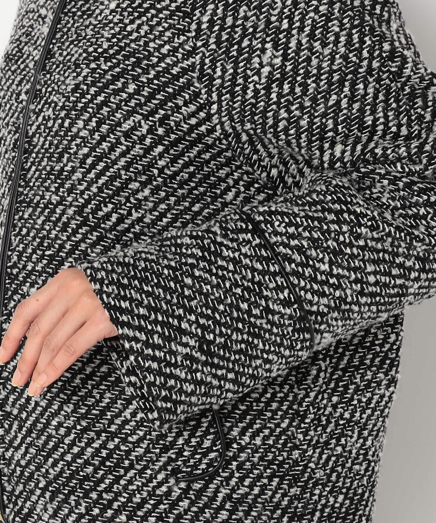 モノトーンのツイード素材が特徴の上品なアウターです。